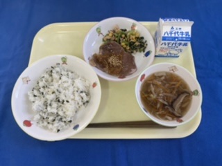 牛乳 しらす入りわかめごはん トンテキたまねぎソース 小松菜のツナ和え 沢煮椀 |