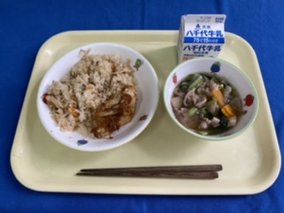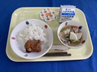 牛乳 子ぎつねご飯 かつおの竜田揚げ 田舎汁 |