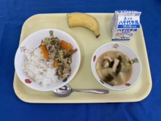 牛乳 ごはん 豚肉の柳川風 キャベツの味噌汁 バナナ |