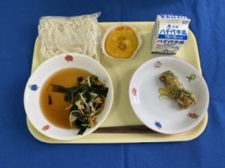 牛乳 冷やしきつねうどん 竹輪の磯部揚げ かぼちゃ蒸しパン |