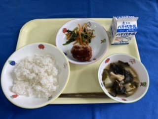 【おはなし給食】 牛乳 ごはん ハンバーグ ごま和え なめこの味噌汁 |