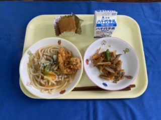 【おはなし給食】 牛乳 煮込みうどん かしわ天 五目きんぴら ぐりとぐらのカステラ |