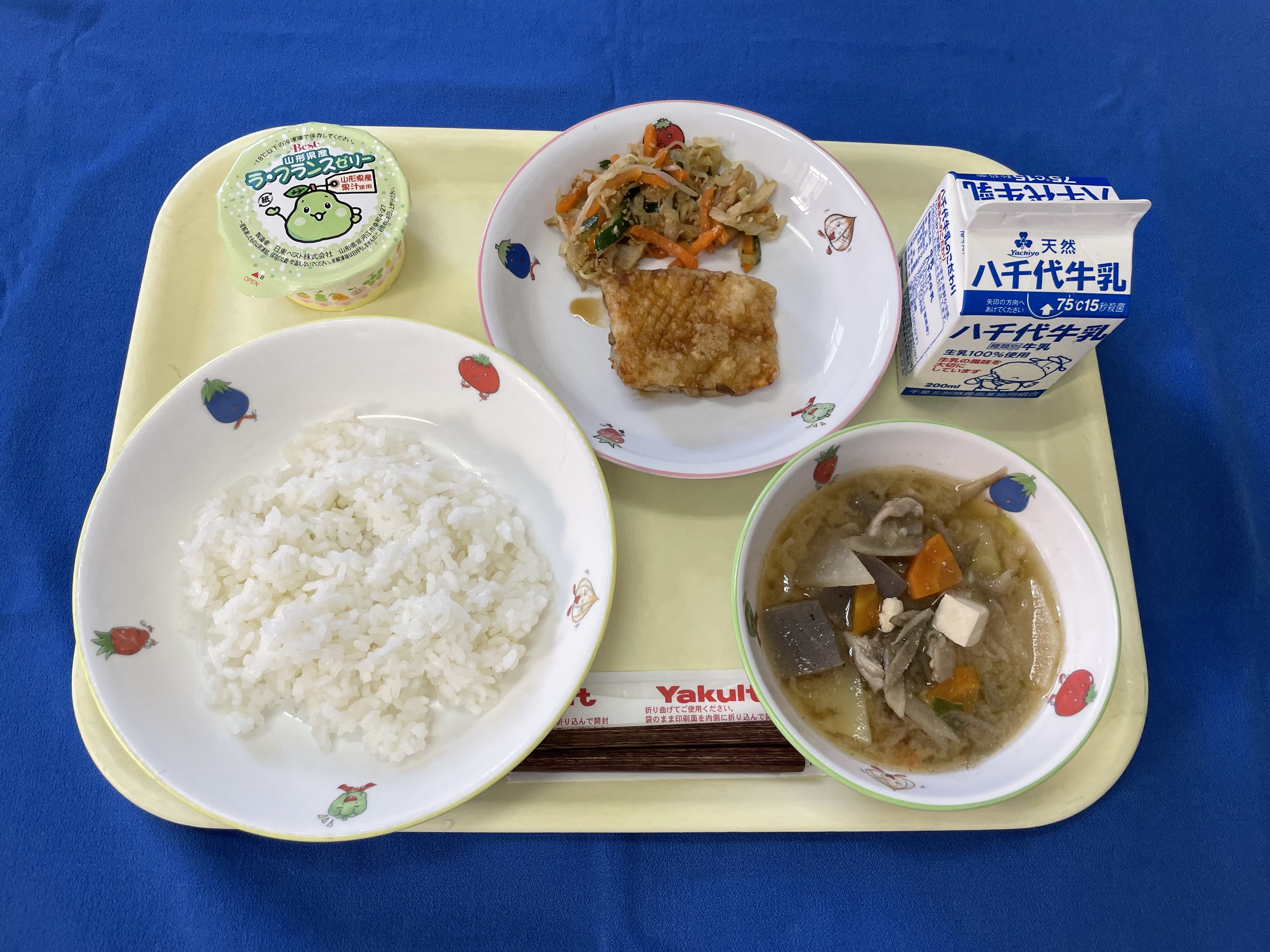 牛乳 ごはん ふりかけ(さば節) ひじき入り卵焼き 豚汁 ヨーグルト |