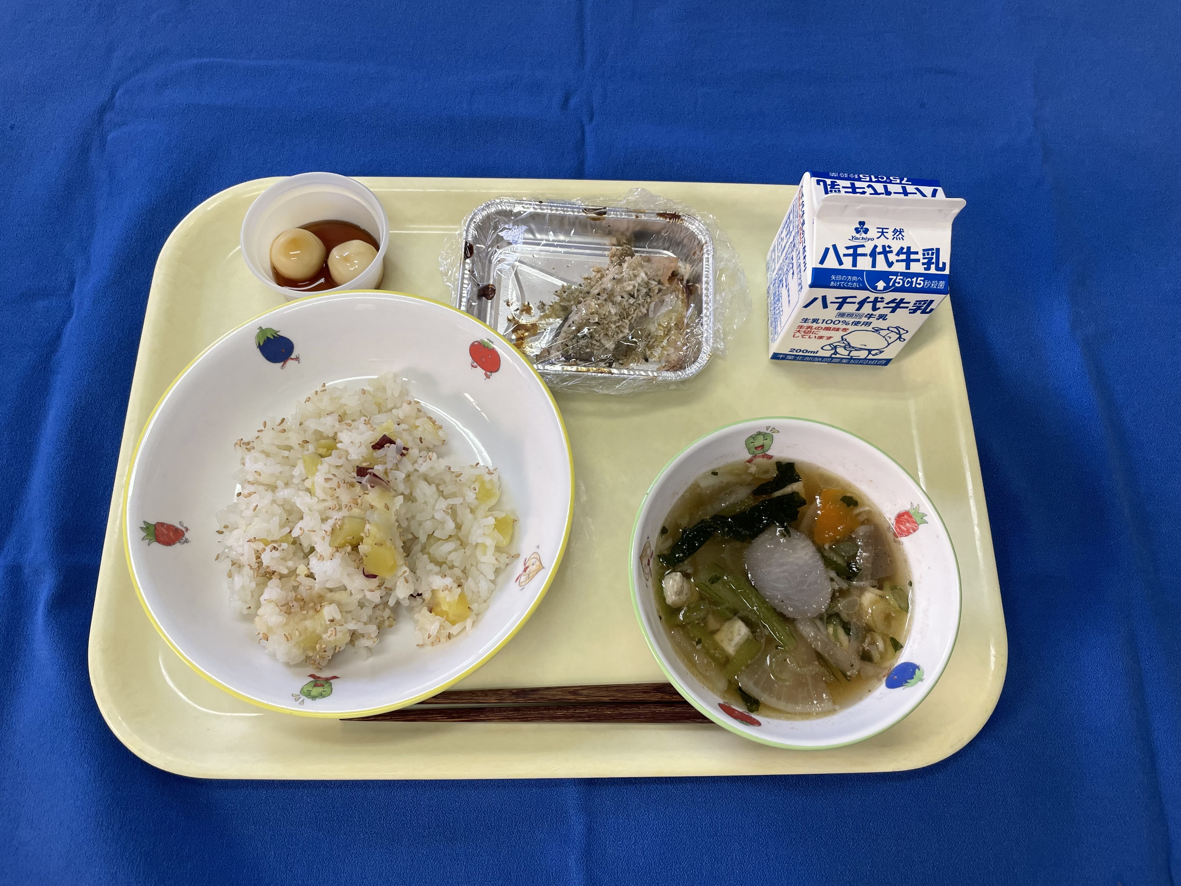 【十五夜献立】 さつまいもご飯 鮭の香草パン粉焼き けんちん汁 月見団子 牛乳 |