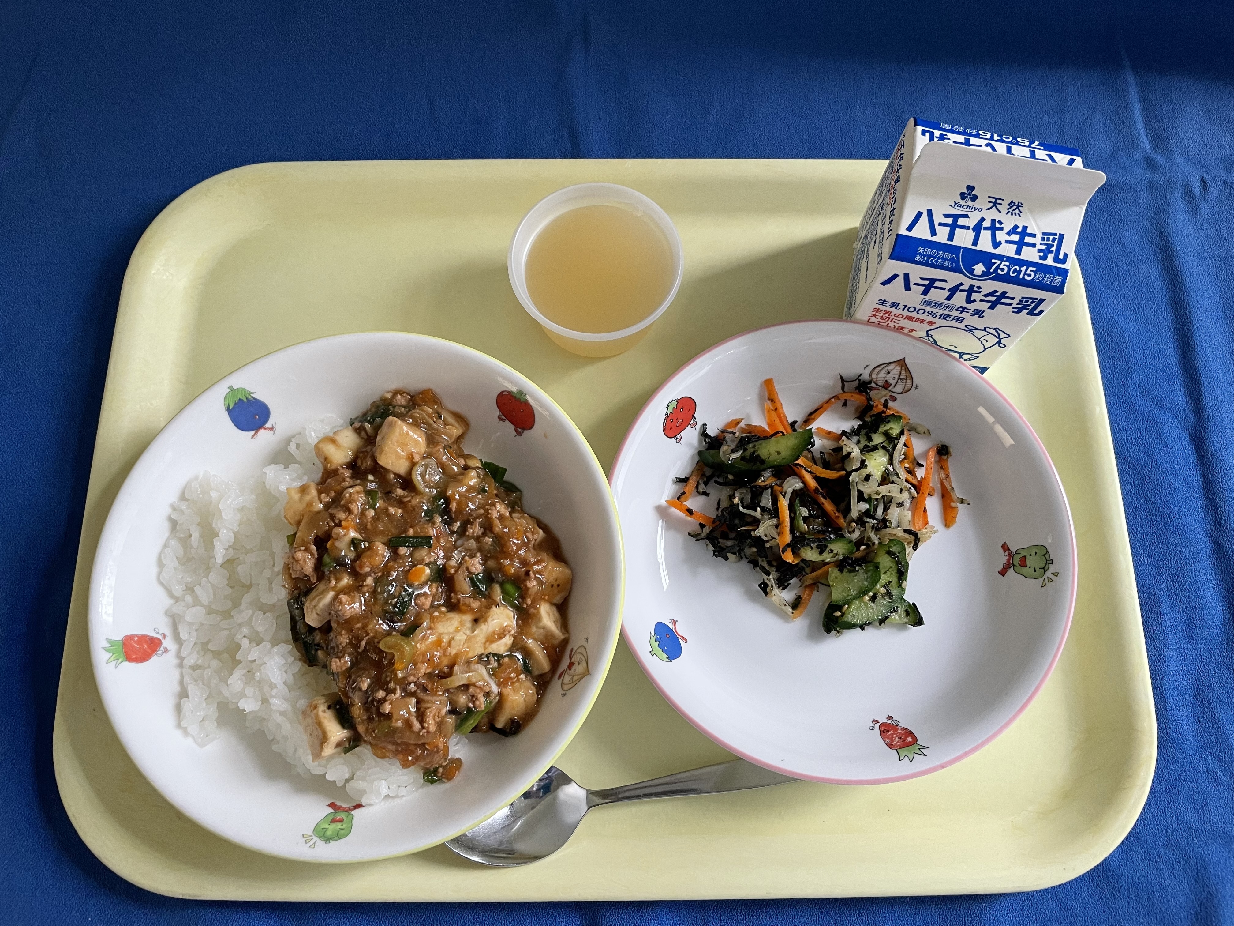 ご飯 マーボー豆腐 しらすと大根のサラダ ピーチゼリー 牛乳 |