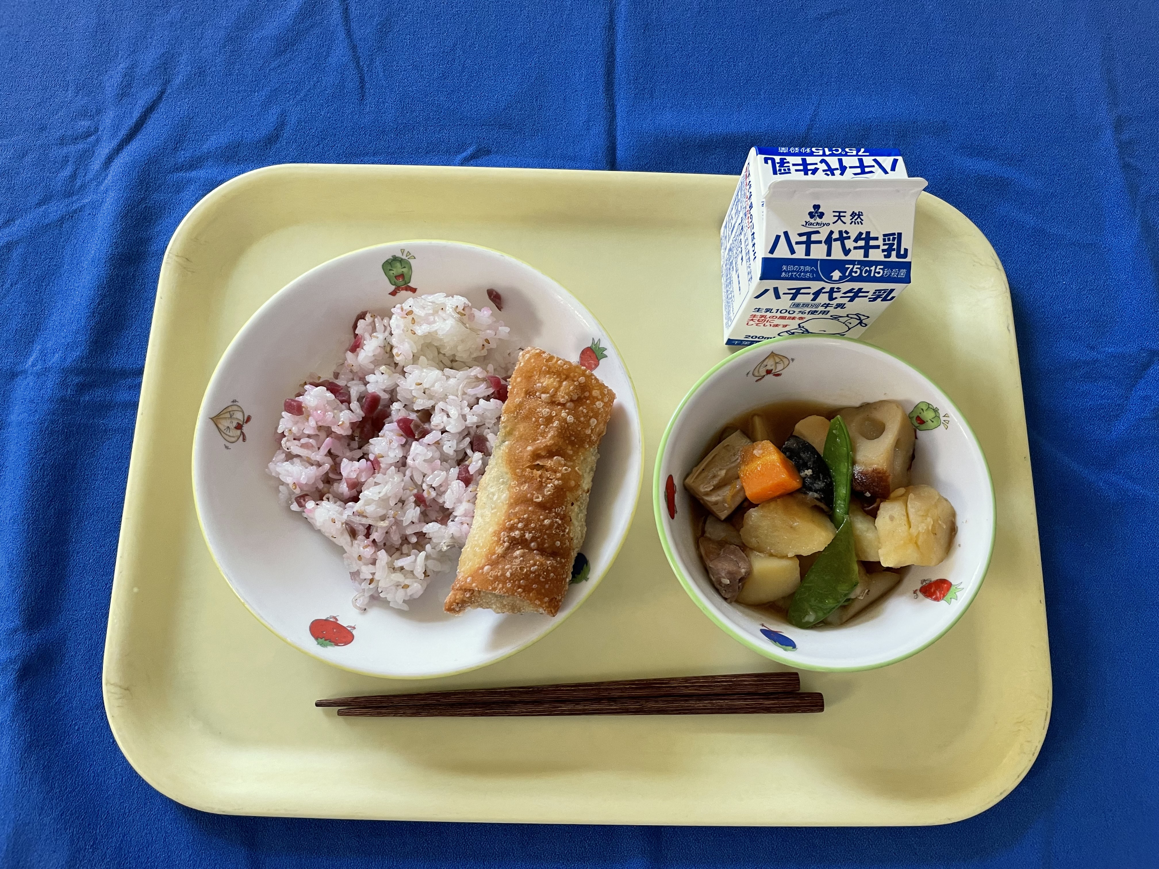 梅ご飯 ポテトひじき春巻き いり鶏煮 牛乳 |