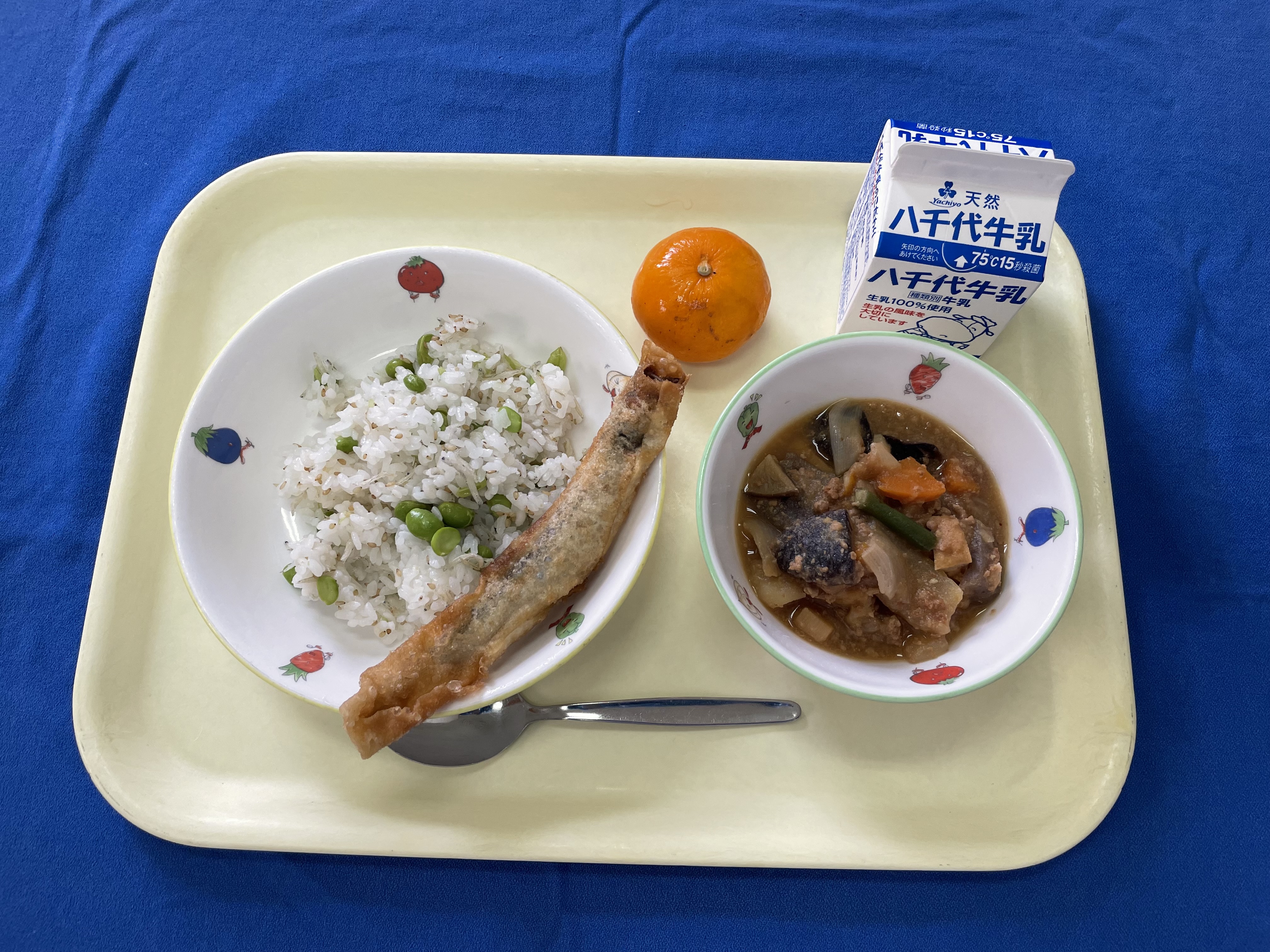 枝豆ごはん ししゃもパリパリ揚げ 生揚げの肉味噌煮 冷凍みかん 牛乳 |