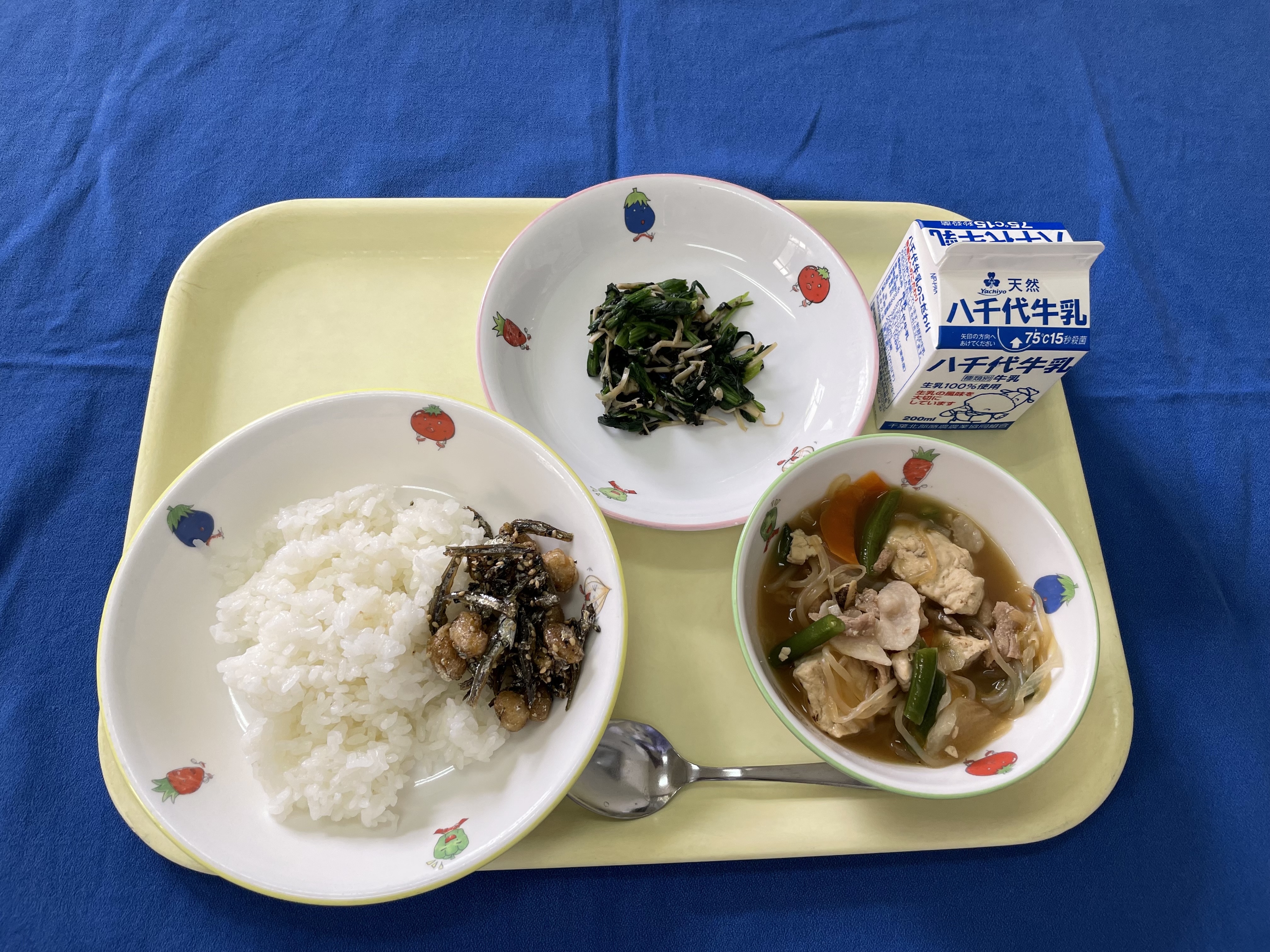 ご飯 ふりかけ 千草卵 小松菜のツナ和え いり鶏煮 牛乳 |