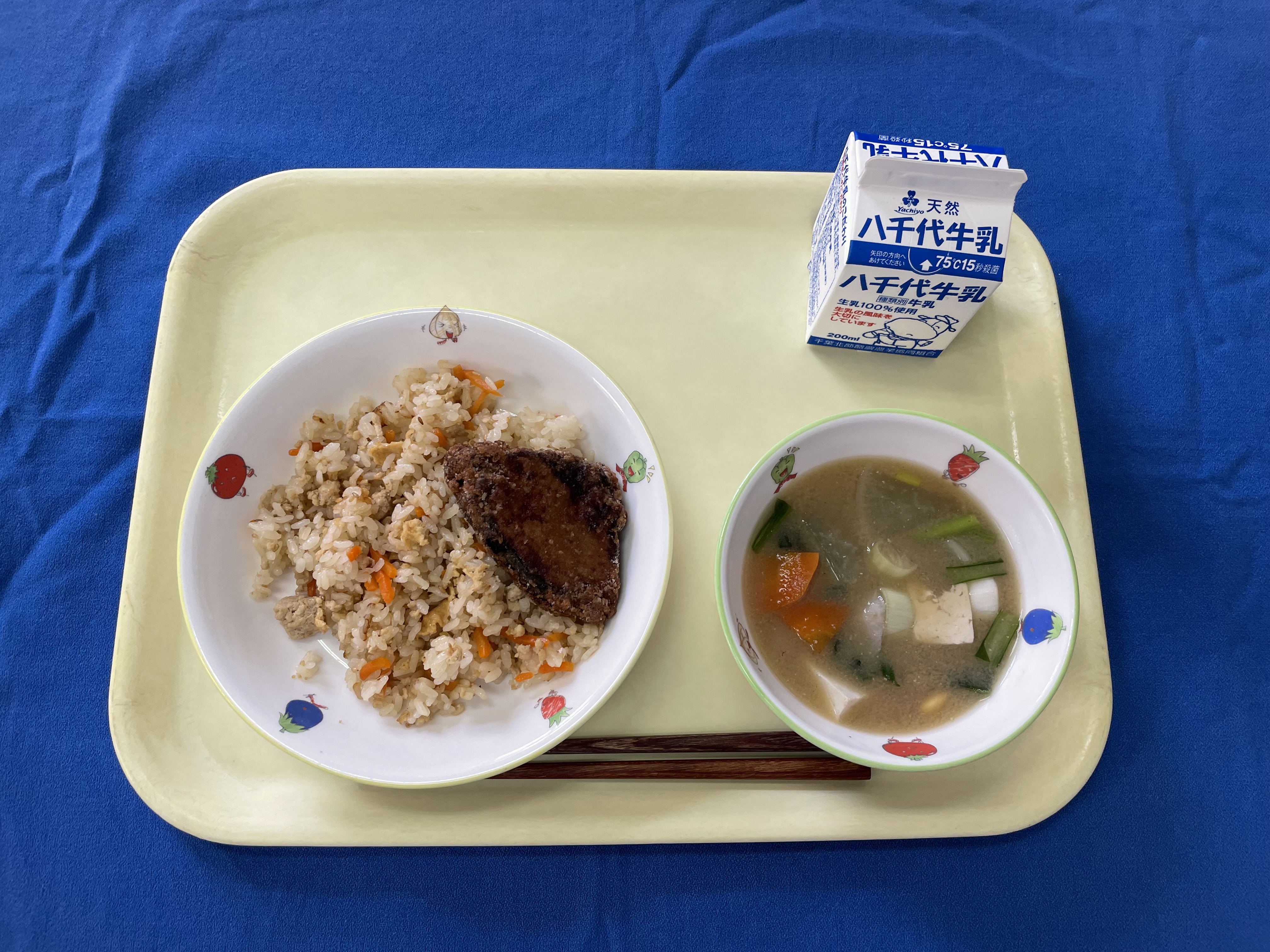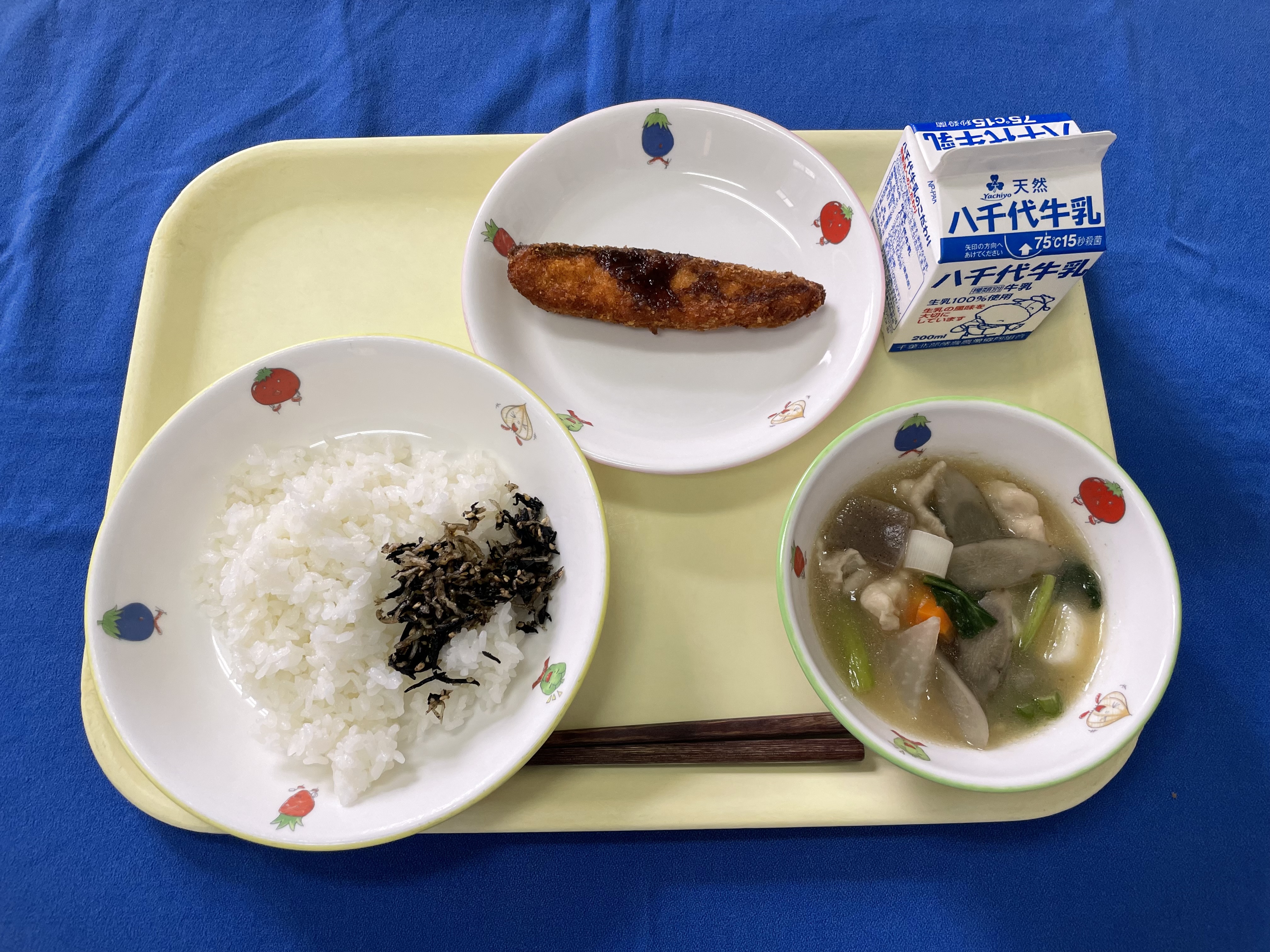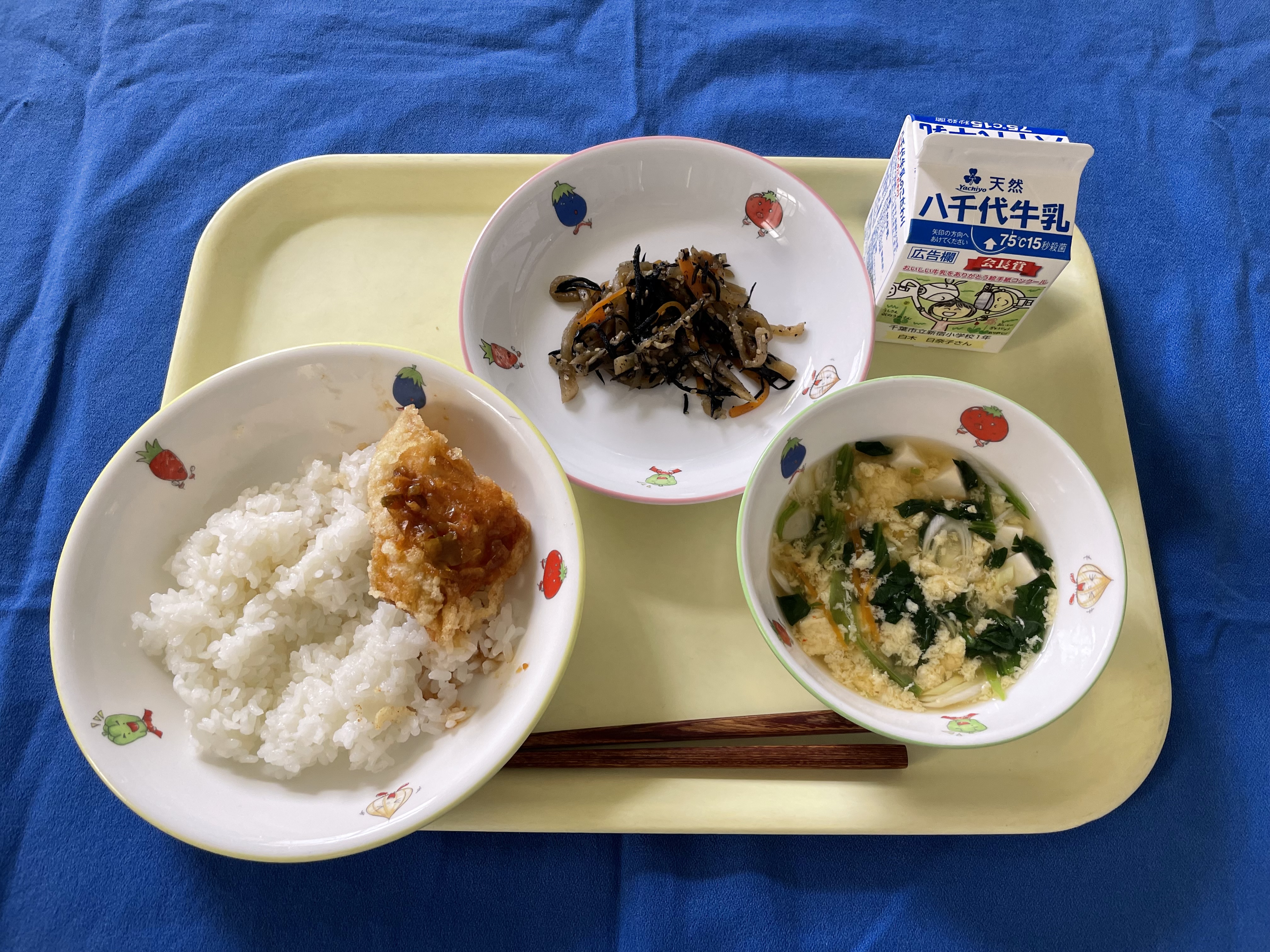 子ぎつねご飯 鰹の竜田揚げ 田舎汁 牛乳 |