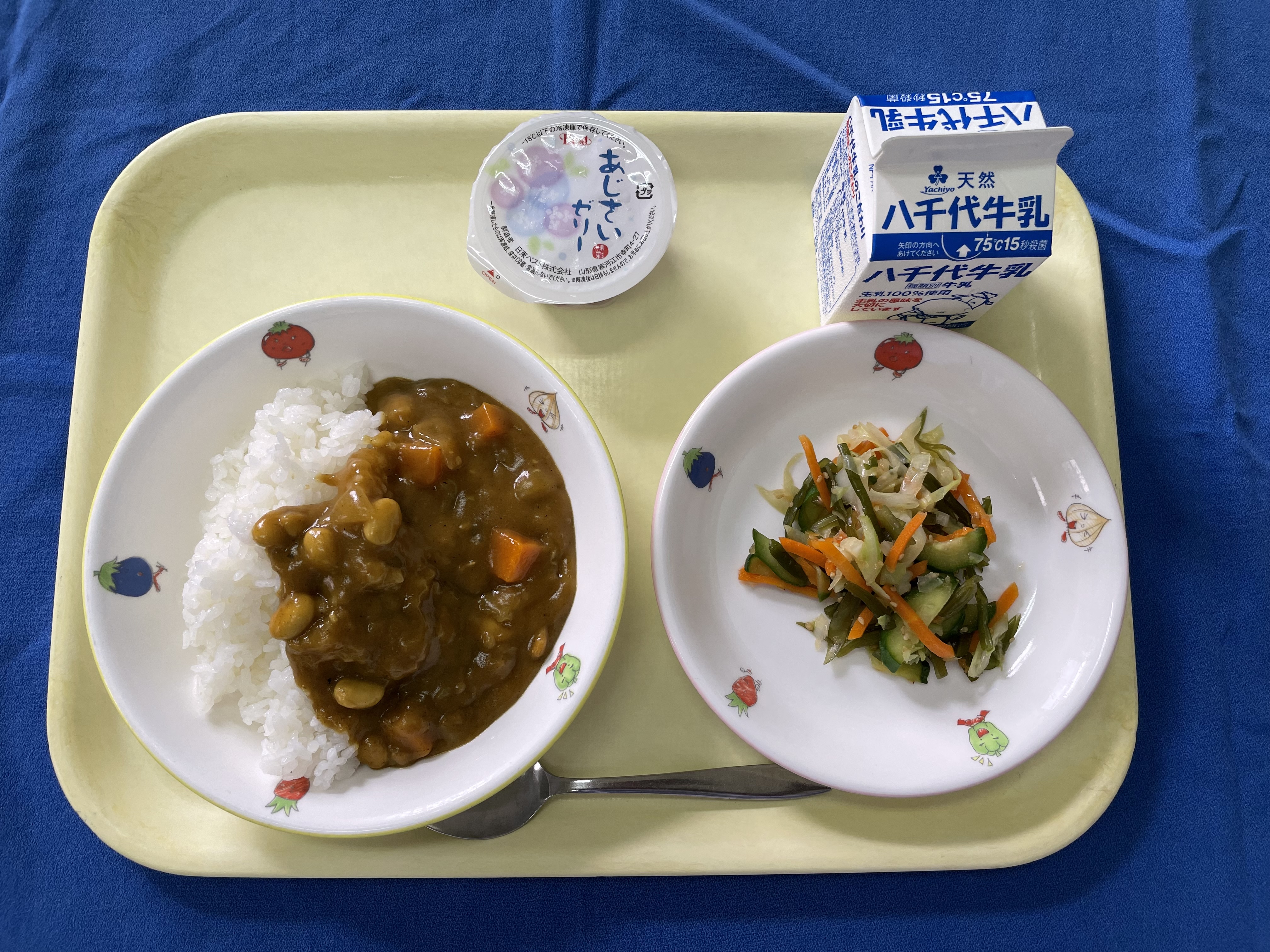 ご飯 ビーンズカレー 茎わかめのサラダ あじさいゼリー 牛乳 |