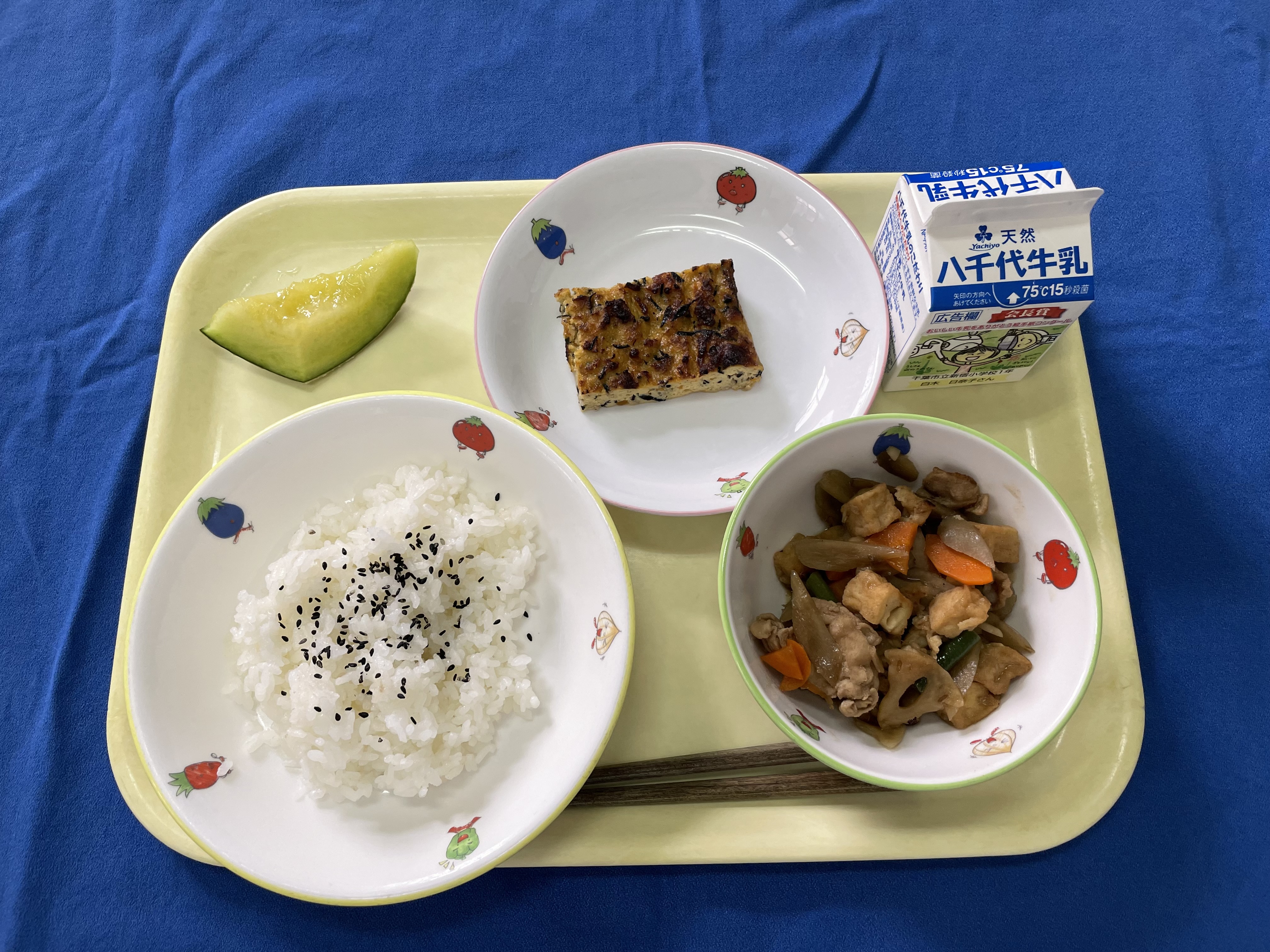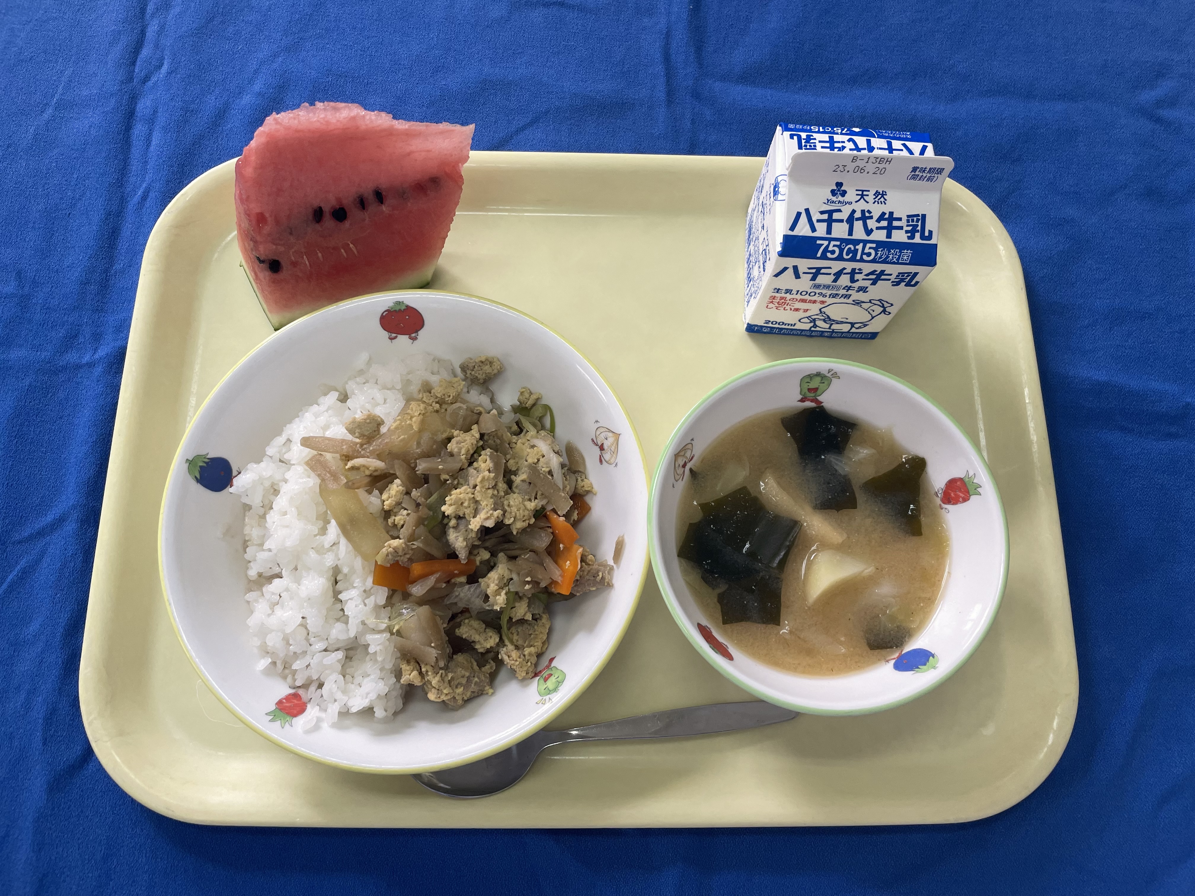 牛乳(千葉) 米(千葉) にんじん(千葉/船橋) 玉ねぎ(千葉/長生) 長ネギ(千葉/長生) じゃがいも(千葉/多古) キャベツ(千葉/松戸) ごぼう(青森) 豚もも肉(千葉) すいか(千葉/富里) |