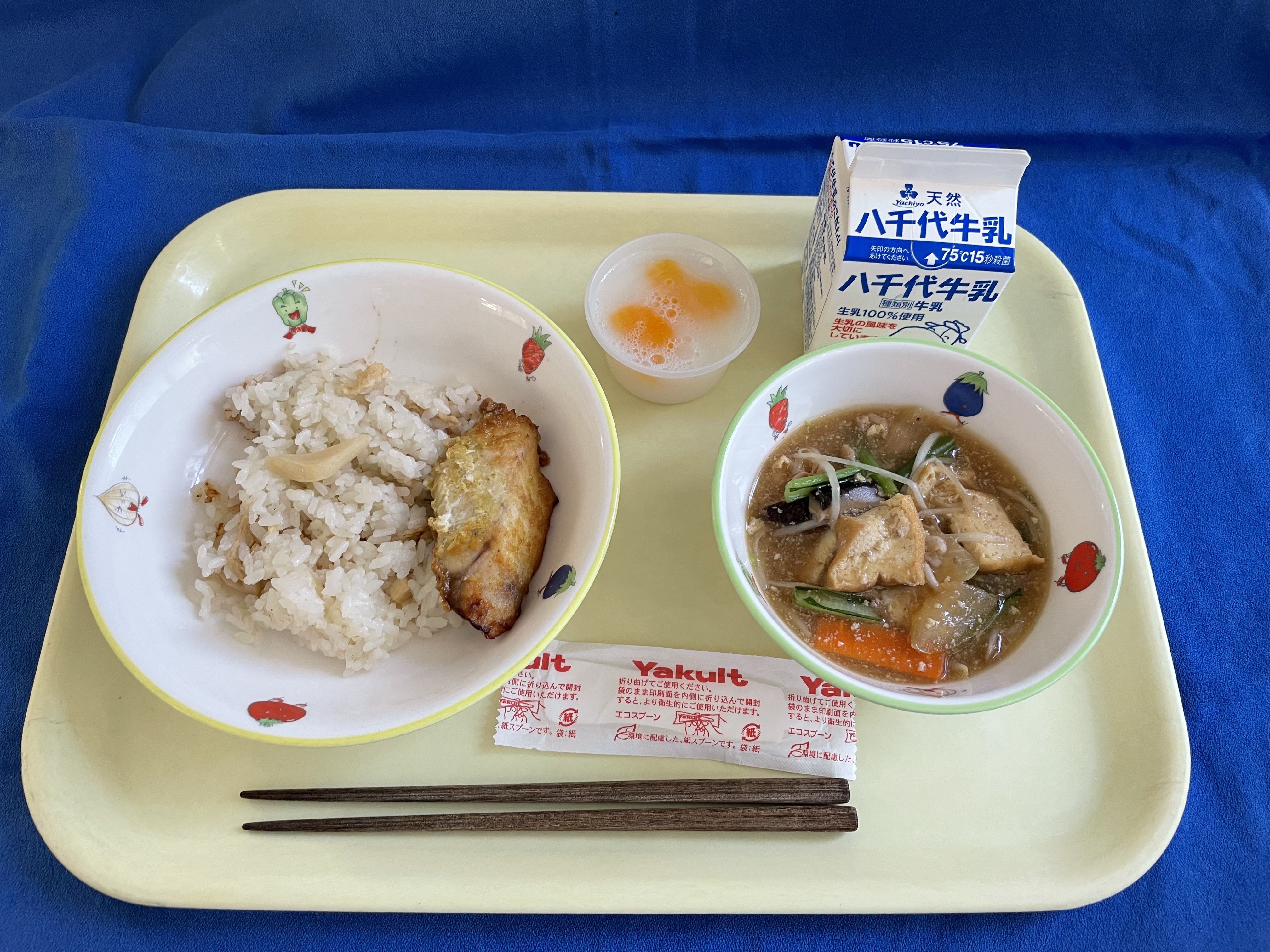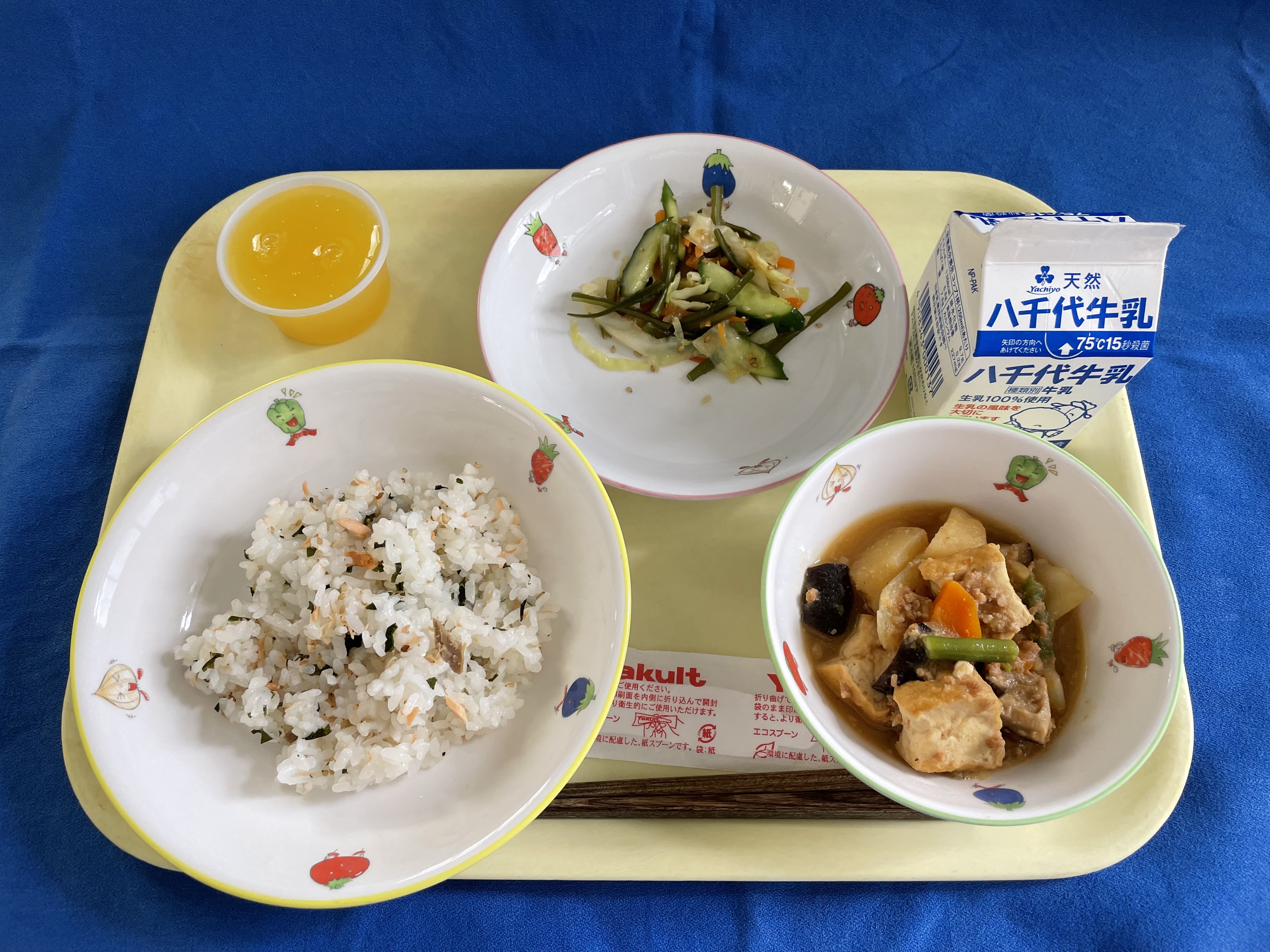たけのこごはん さばカレー焼き 生揚げと野菜のうま煮 カルピスゼリー 牛乳 |
