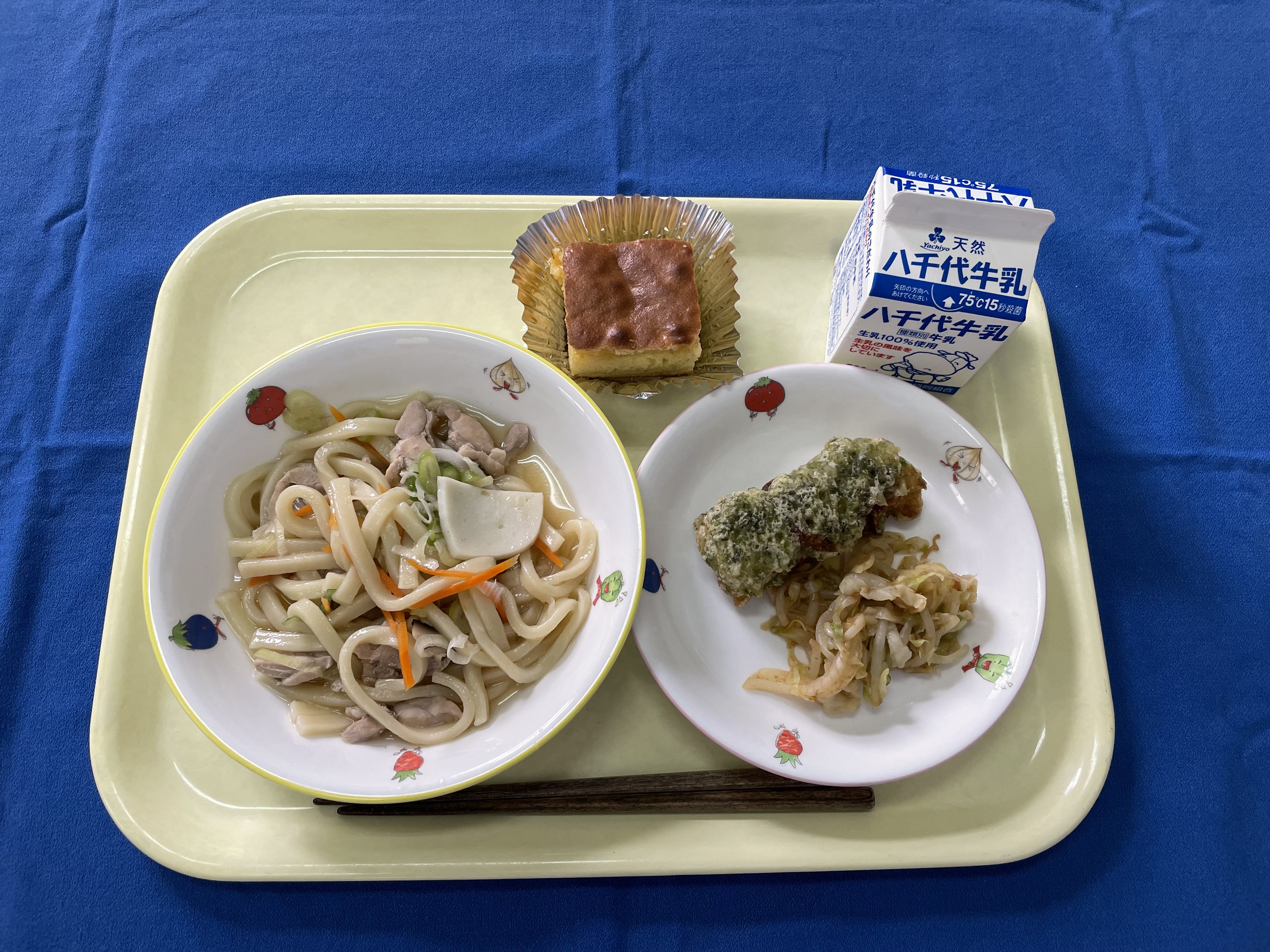 【おはなし給食~ぐりとぐらのカステラ~】 煮込みうどん ちくわの磯部揚げ キャベツと梅かつお和え ぐりとぐらのカステラ 牛乳 |