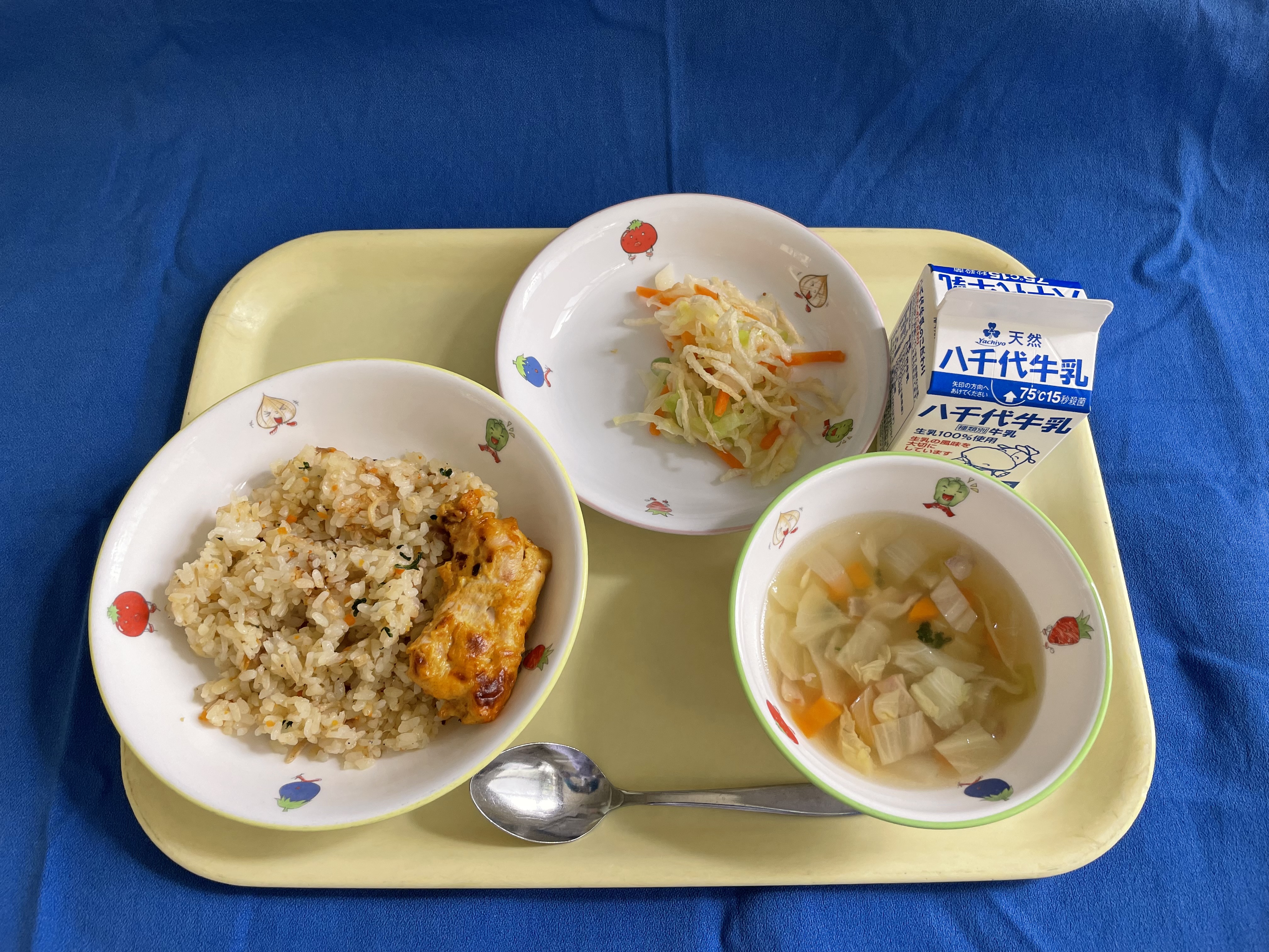 ジャコガーリックライス タンドリーチキン じゃがいものハニーサラダ ABCスープ 牛乳 |
