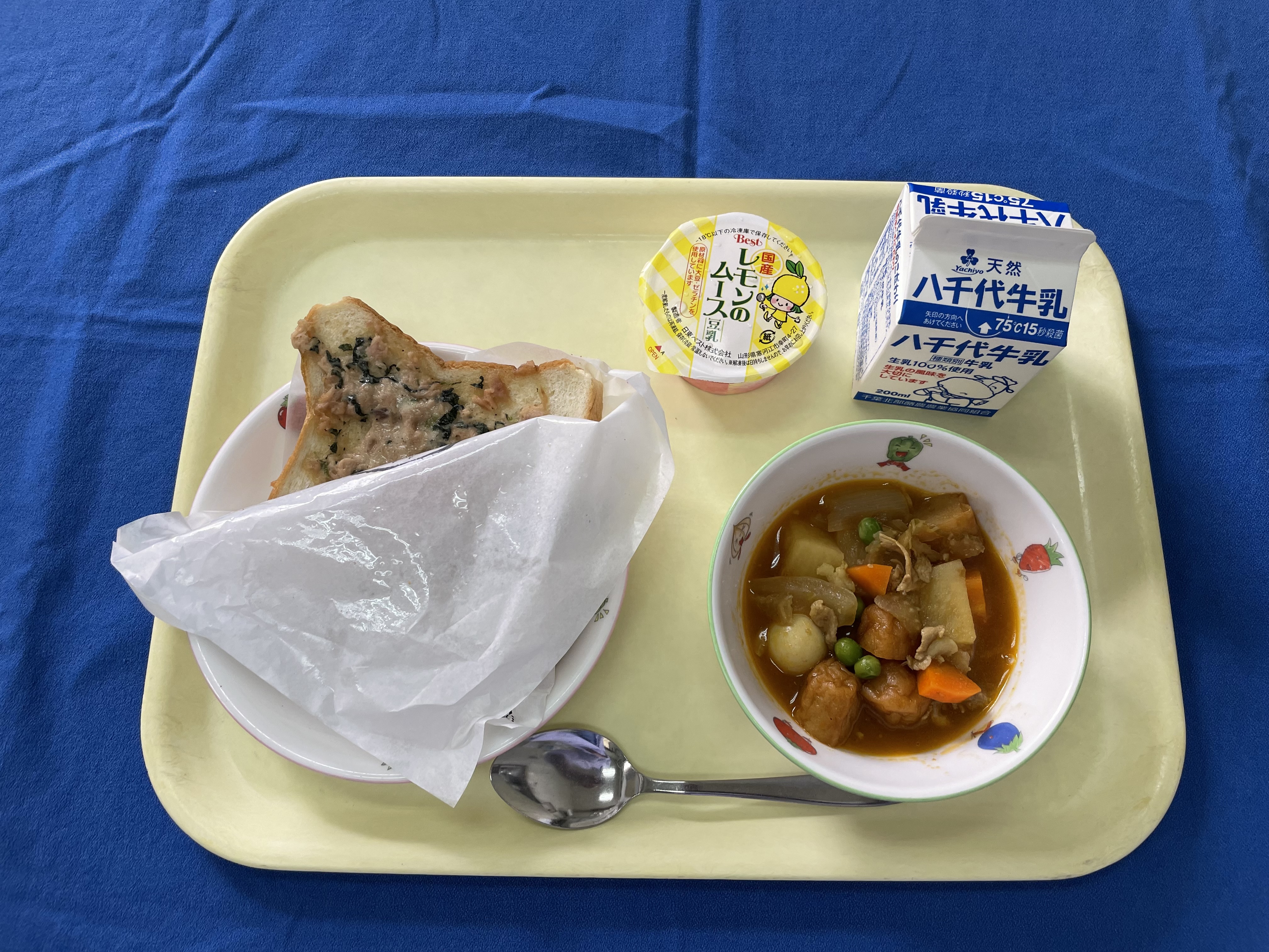 こまツナマヨトースト インド煮 レモンムース 牛乳 |