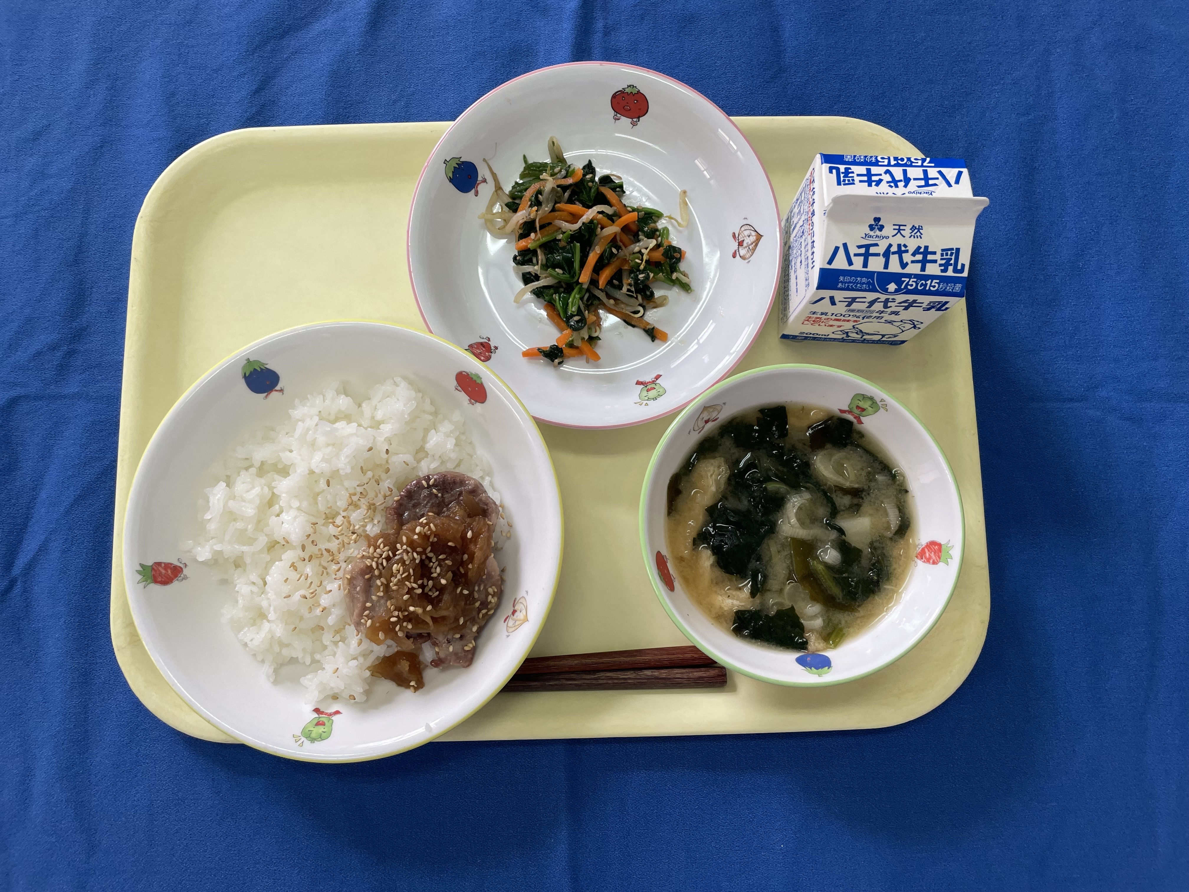 ご飯 トンテキ玉ねぎソース ごま和え 味噌汁 牛乳 |