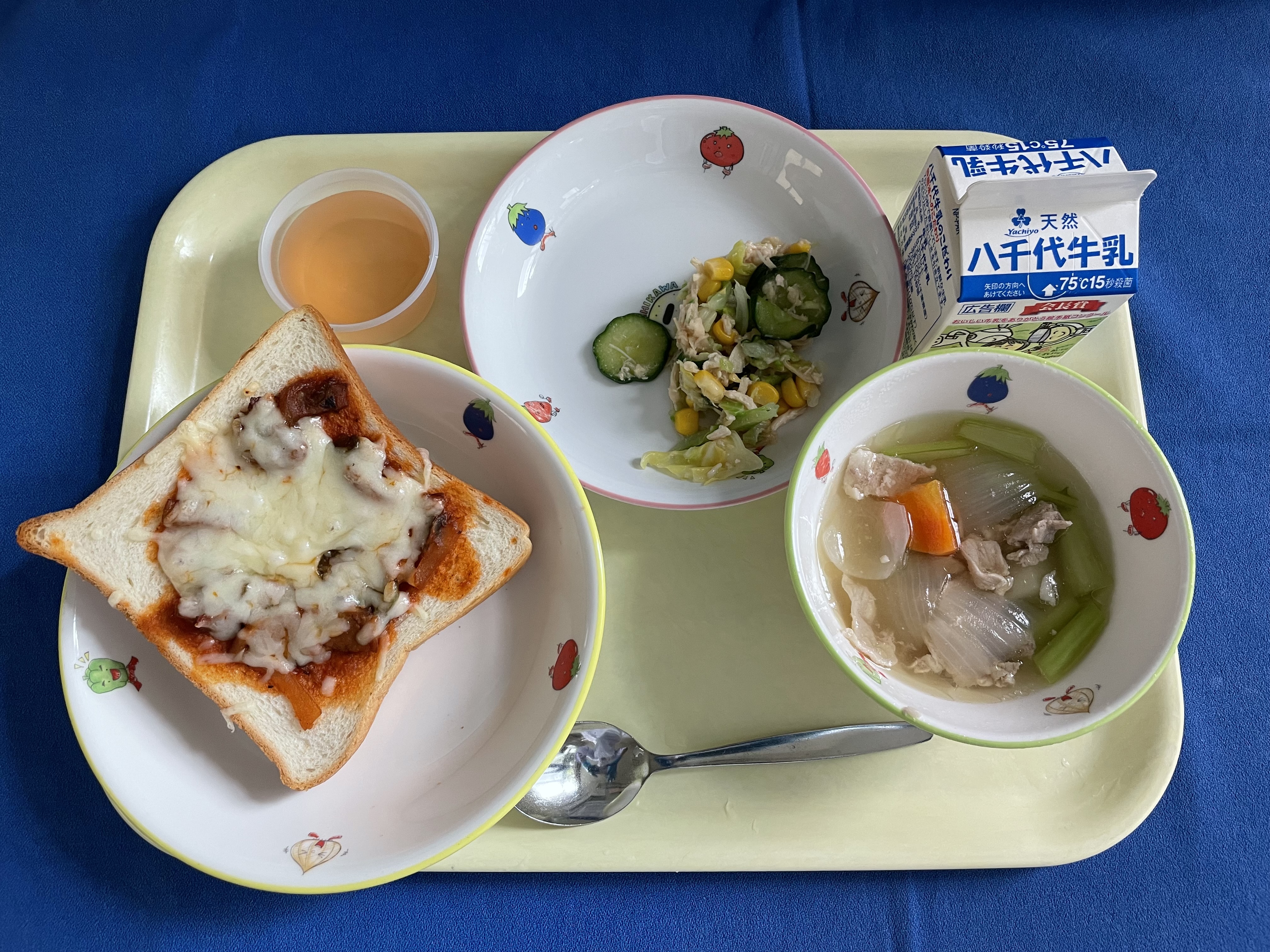ピザトースト かぶのポトフ コーンとささみのサラダ アセロラゼリー 牛乳 |