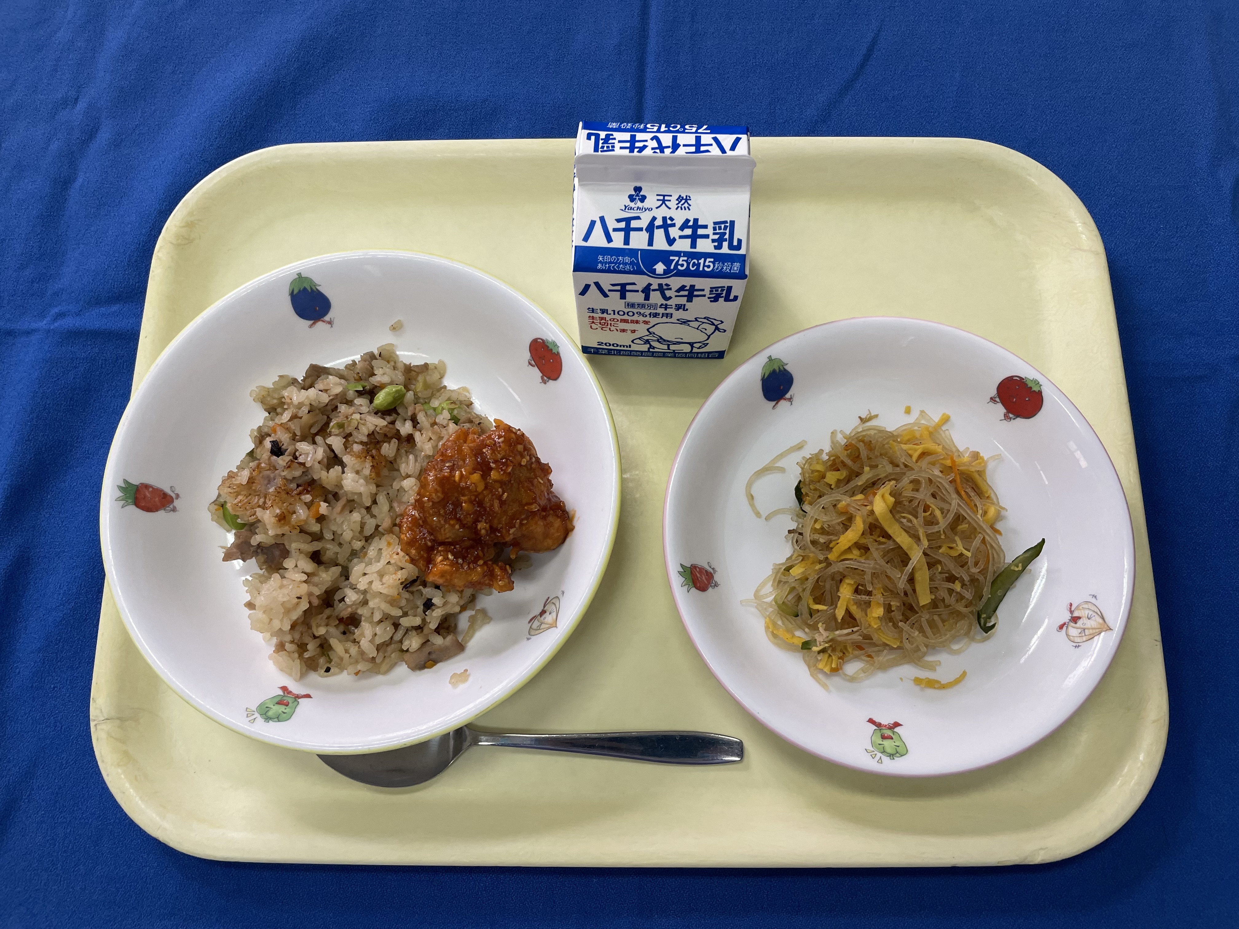 ご飯 ヤンニョムチキン 春雨炒め トマトと卵のスープ 牛乳 |