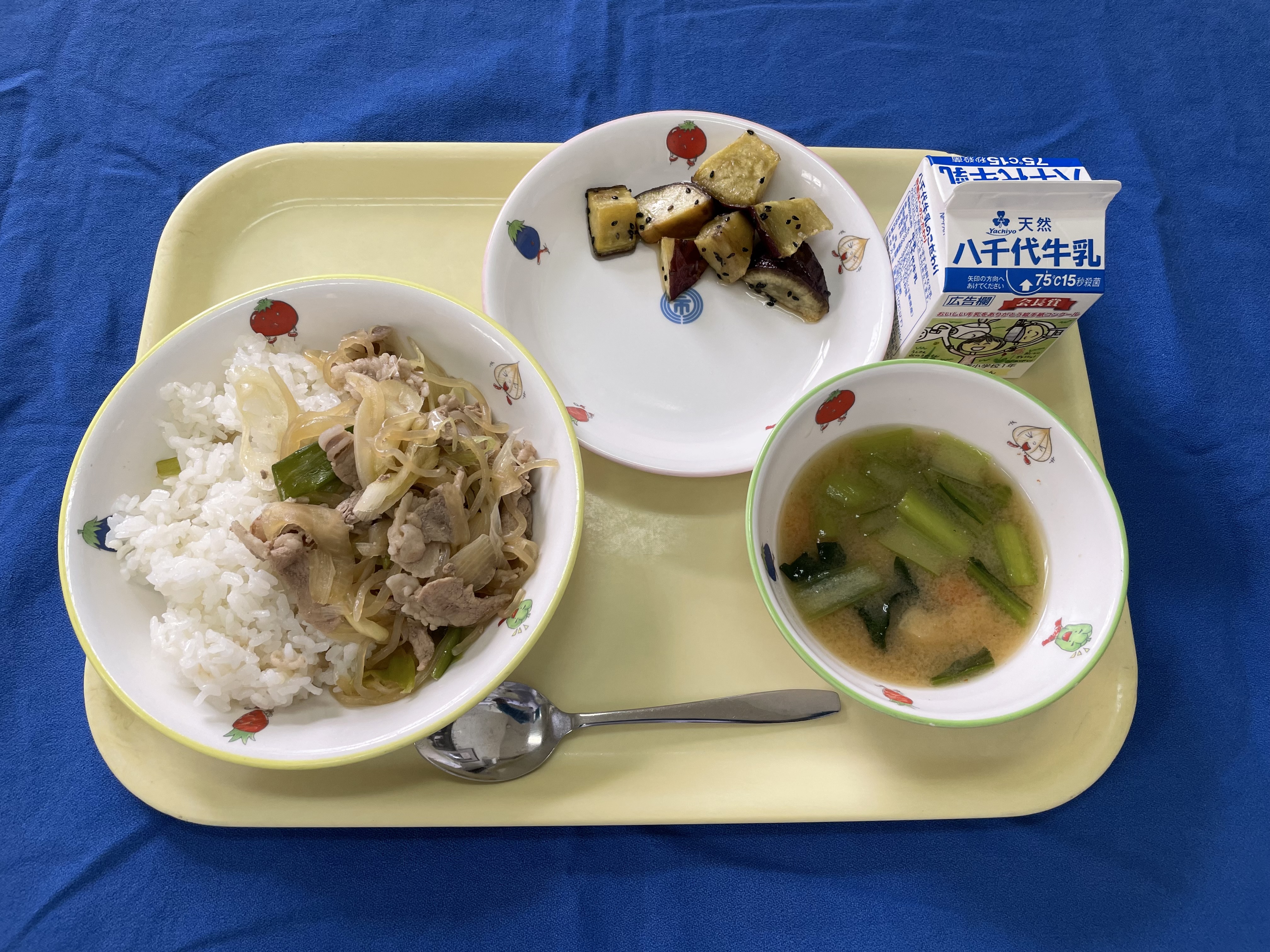 麦ごはん 豚丼 味噌汁小松菜 大学芋 牛乳 |