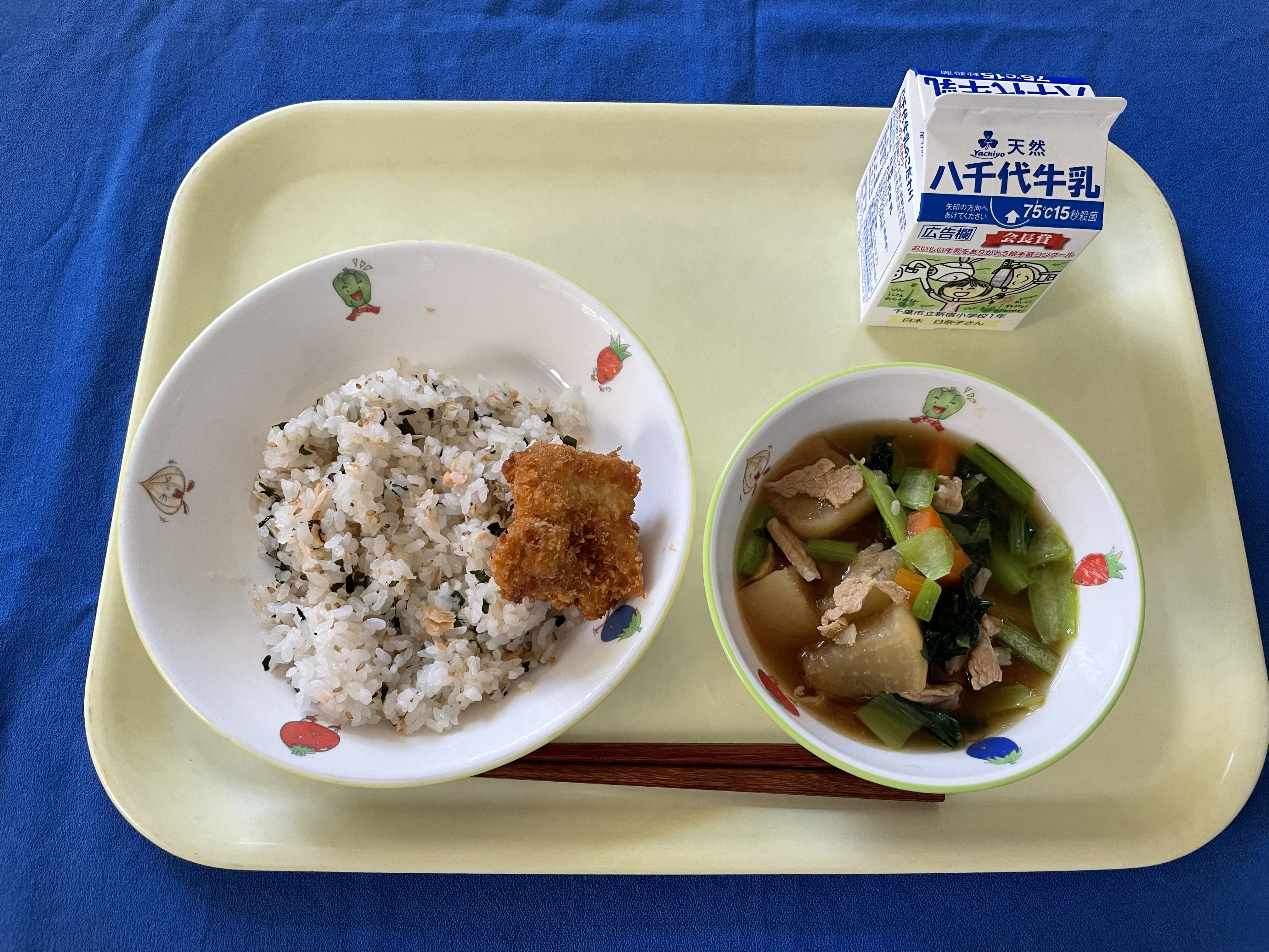鮭わかめご飯 チキンカツ 大根と豚肉の煮物 牛乳 |