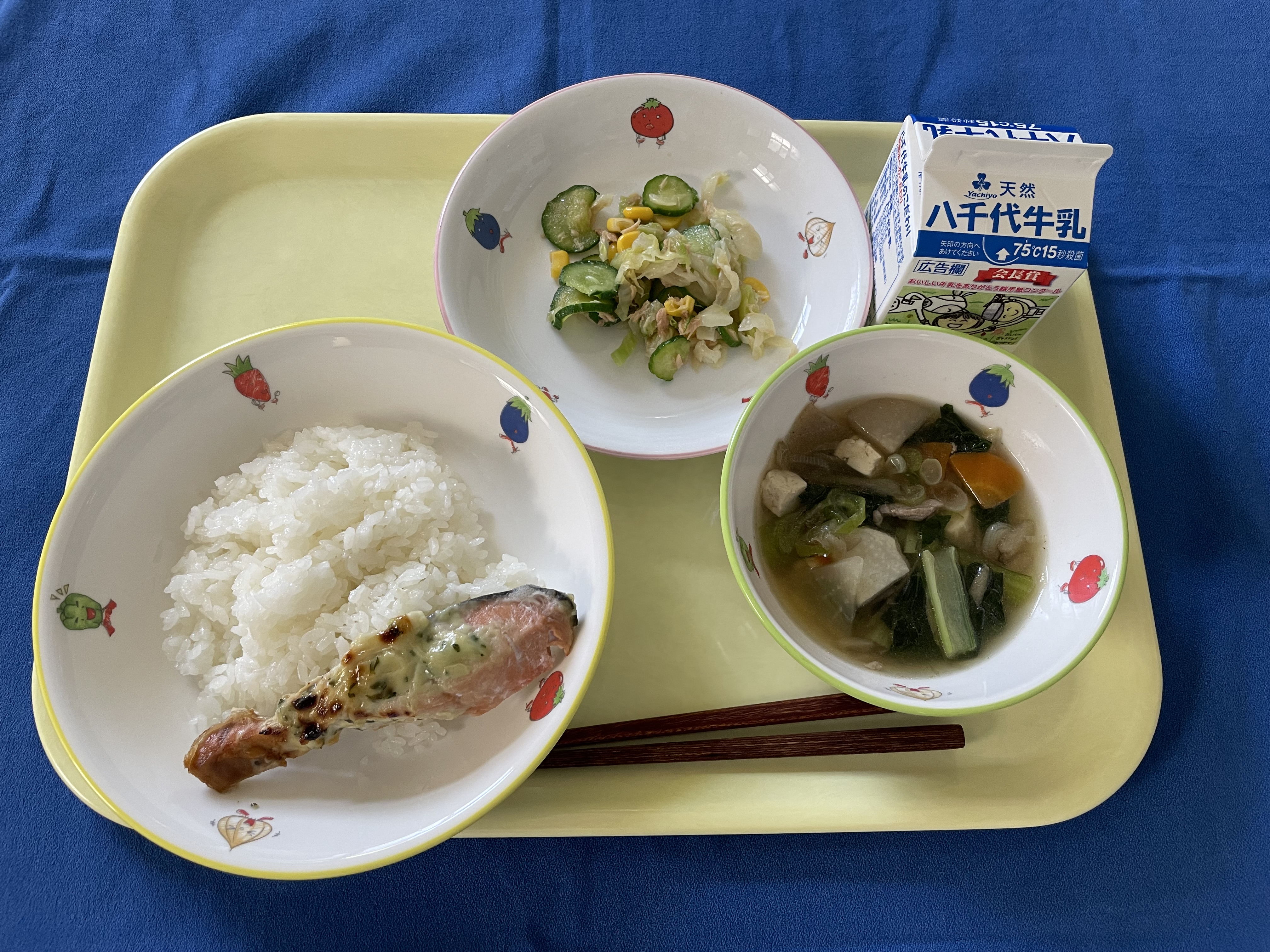 ご飯 鮭の味噌マヨネーズ焼き コーンサラダ けんちん汁 牛乳 |