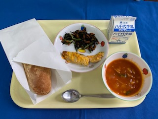 【6年1組献立】 牛乳 あげぱん(きなこ) 鮭のもみじ焼き ひじきのマリネ ミネストローネ 今日は6年1組が家庭科の授業で考えた献立です。 |