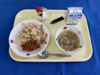 【クリスマス献立】 牛乳 ミルメーク ジャコガーリックライス フライドチキン マカロニスープ クリスマスデザート |