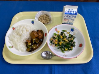 牛乳 ごはん 豚とナスのカレーあんかけ 小松菜のツナ和え 黒糖大豆 |