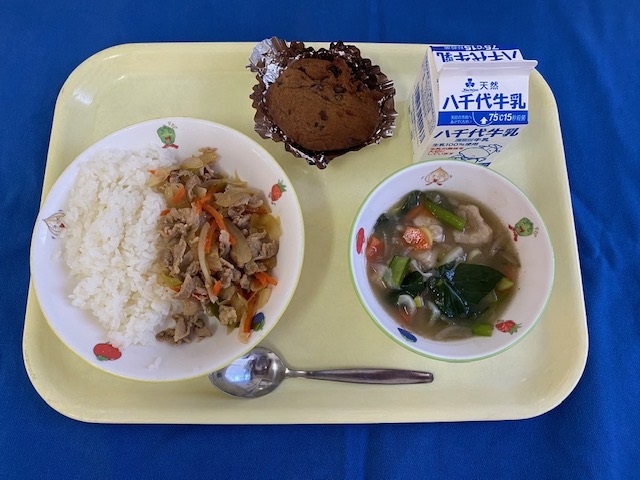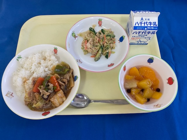 牛乳、米、豚(千葉) たまねぎ(北海道/北見) にんじん(千葉/八街) ピーマン(宮崎/宮崎) なす(栃木/はが野) 小松菜(埼玉/八潮) しょうが(高知/香美) |
