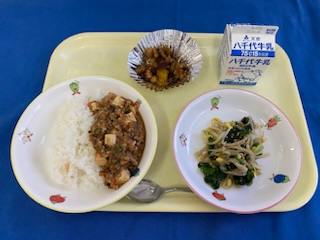 牛乳 ごはん マーボー豆腐 もやしのナムル キャラメルポテト |