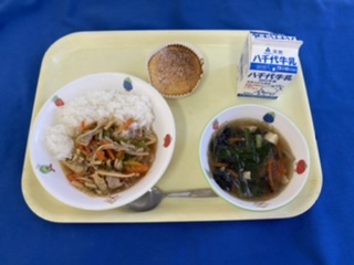 【6年2組献立】 牛乳 ロコモコ丼 (ごはん、ハンバーグ、目玉焼き) 野菜スープ 紅茶と桃のゼリー ※今日は家庭科の授業で6年2組が考えた献立です。 |