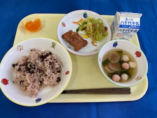 【卒業祝い献立】 牛乳 赤飯 鶏の照り焼き ごぼうとレンコンのサラダ すまし汁 せとか |