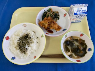 牛乳 ごはん ふりかけ ぶりカツ ほうれん草の磯和え なめこ汁 |