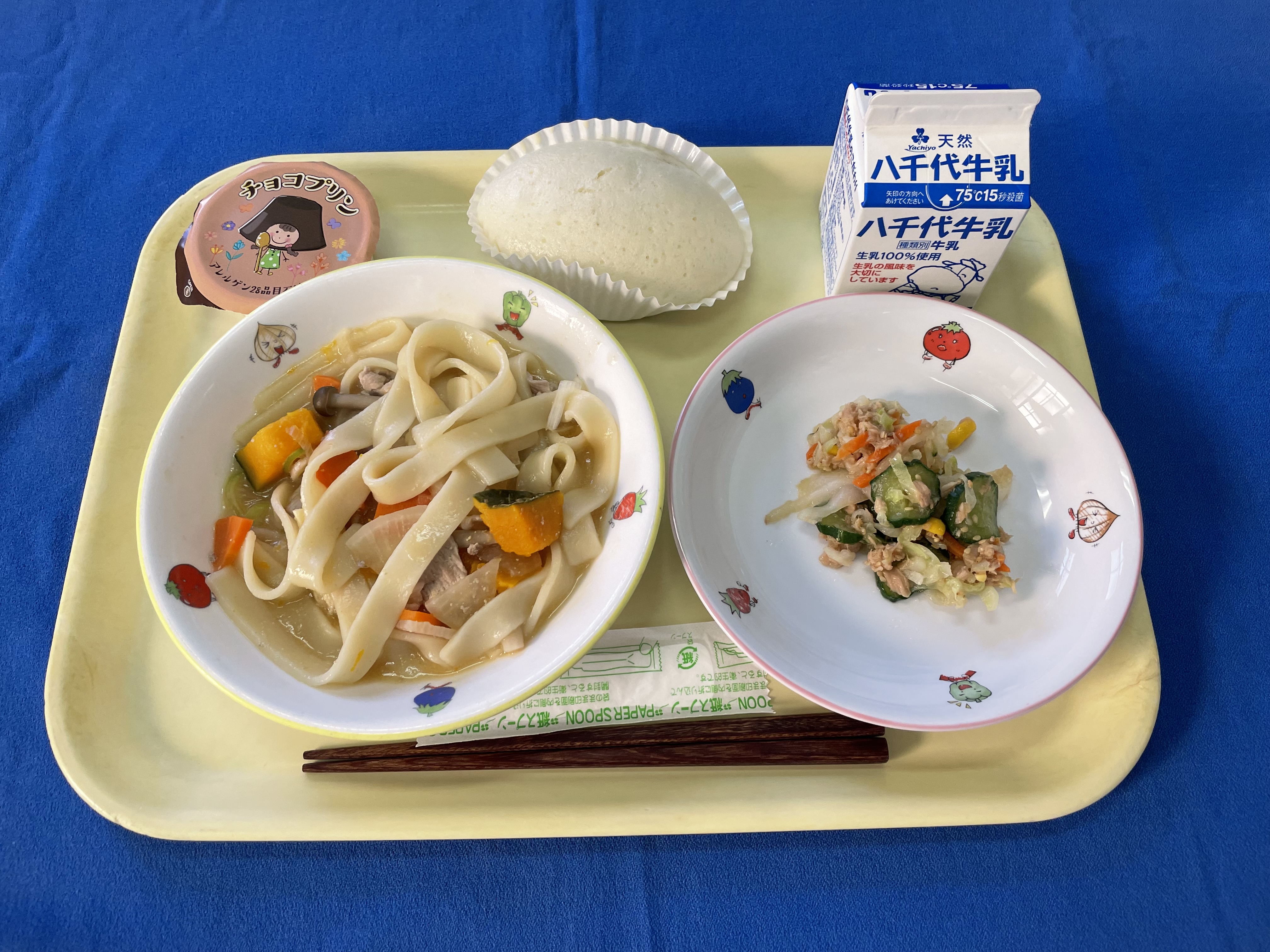 ほうとう ツナサラダ 手作り肉まん チョコプリン 牛乳 |