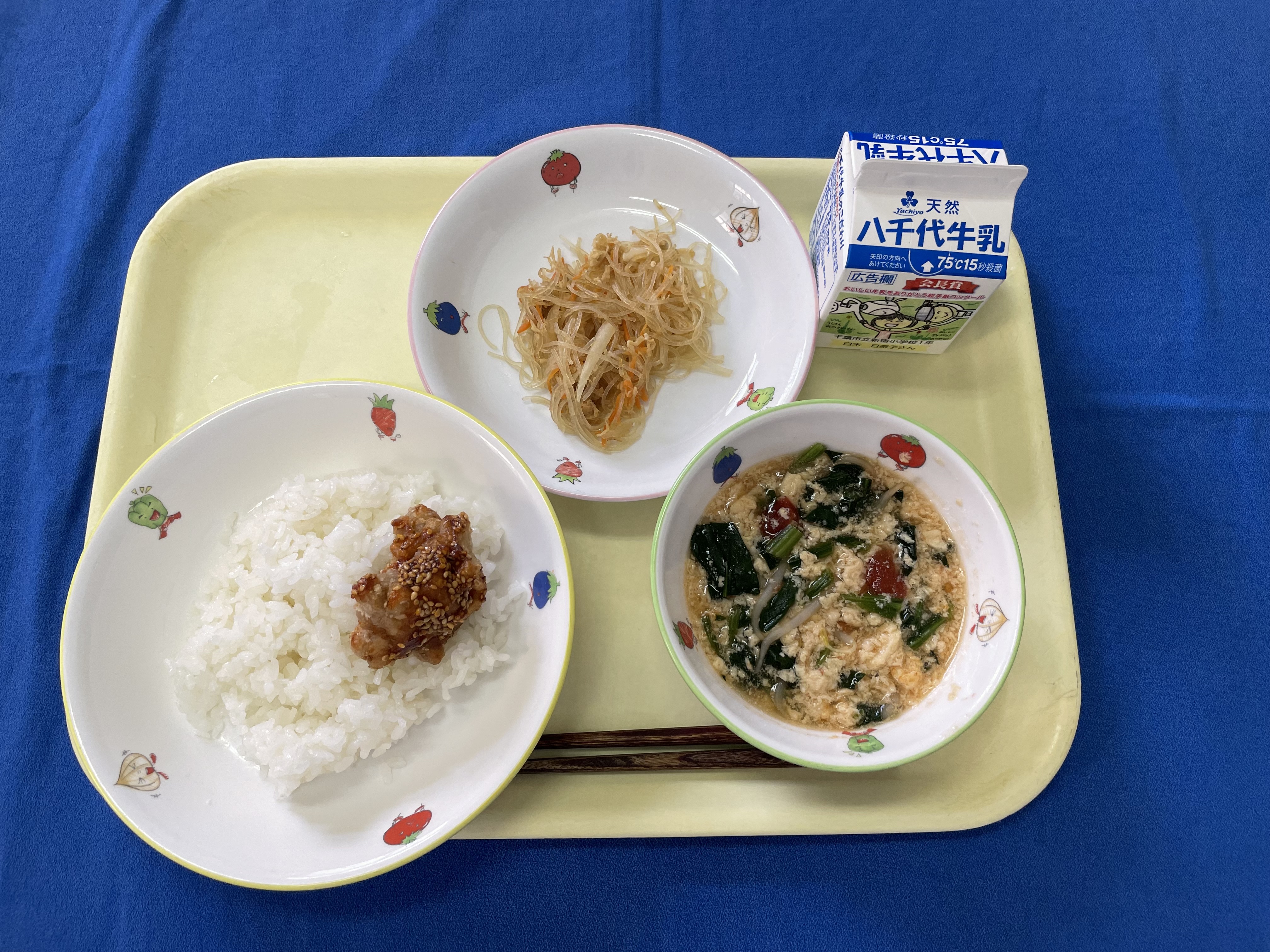 ご飯 ヤンニョムチキン 春雨炒め トマトと卵のスープ 牛乳 |