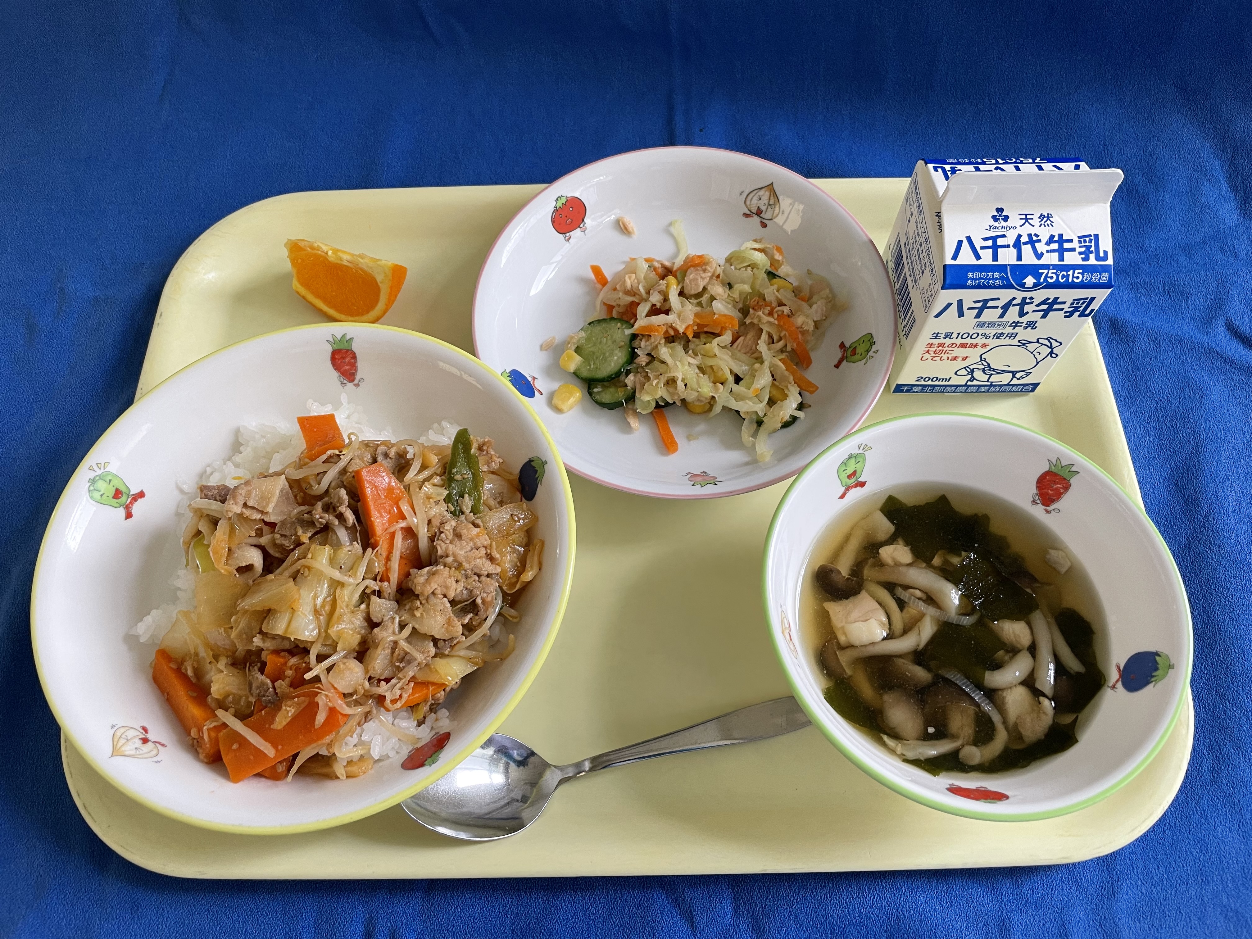 むぎごはん 焼肉丼 ツナサラダ わかめスープ 清美オレンジ 牛乳 |