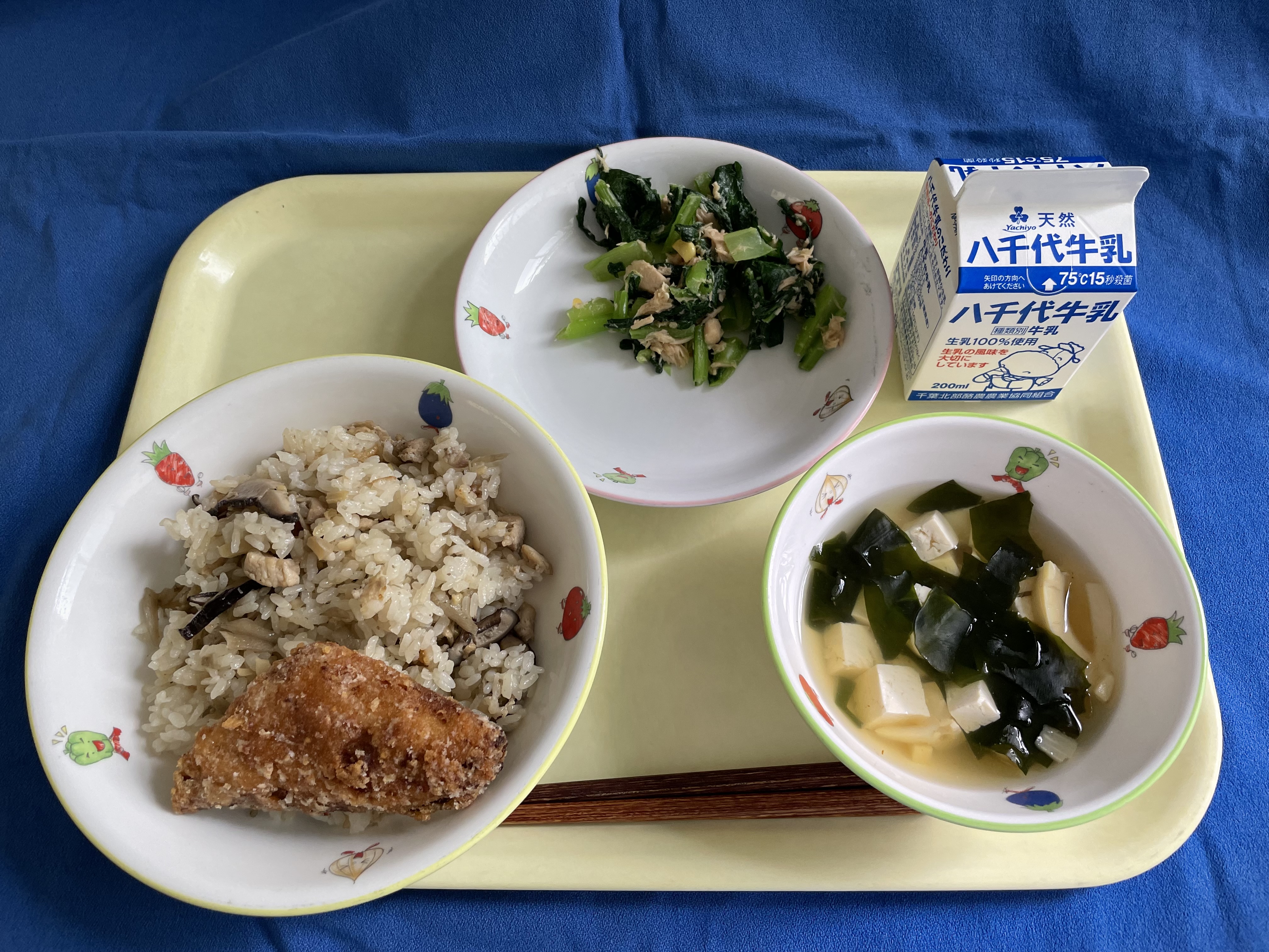 とりごぼうご飯 鯖の唐揚げ 小松菜のツナ和え 若竹汁すまし 牛乳 |