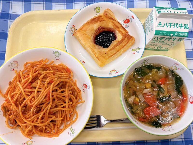スパゲッティナポリタン、コンソメスープ、ブルーベリーパイ、牛乳