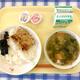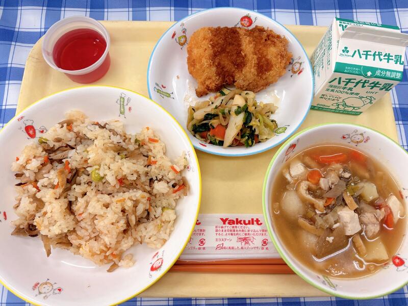 鶏ごぼうごはん、いかフライ、からし和え、だまこ汁、手作りこんにゃくゼリー