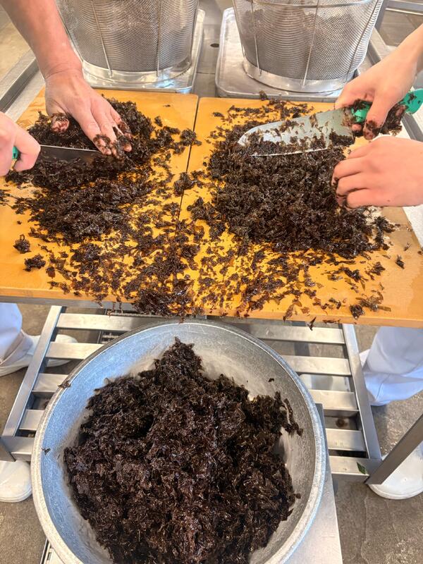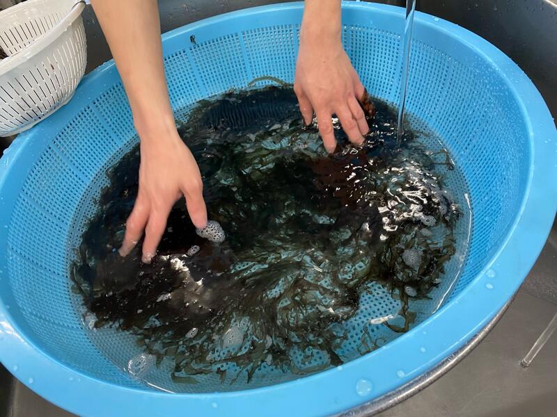 寒い中、調理員さんが冷たい水で少しずつ生のりを洗ってくれています。その量5kg