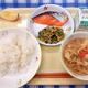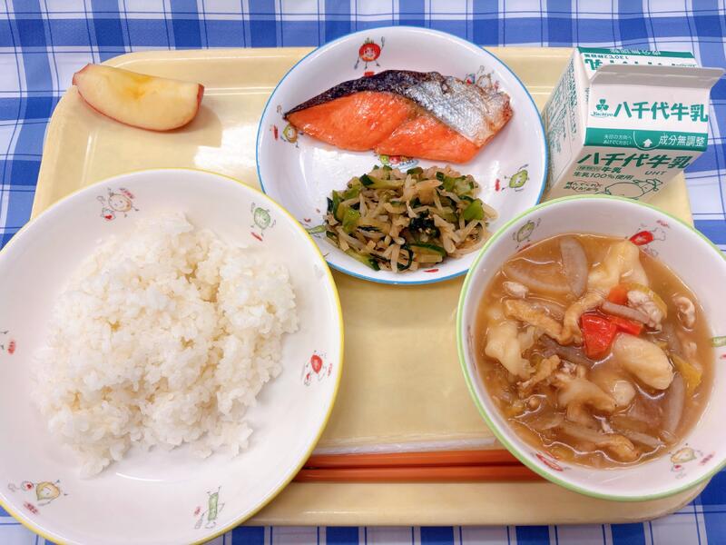 ごはん、鮭の塩焼き、たくあん和え、ひっつみ、りんご、牛乳