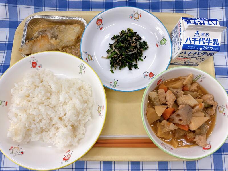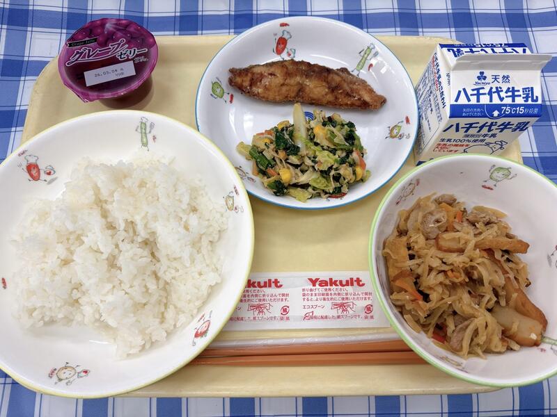 ごはん、いなだの竜田揚げ、ごまマヨ和え、切り干し大根の含め煮、ぶどうゼリー、牛乳