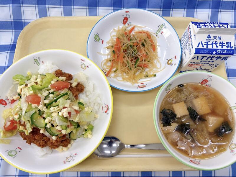 ごはん、タコライス(具)、バンサンスー、生揚げと冬瓜の中華スープ、牛乳