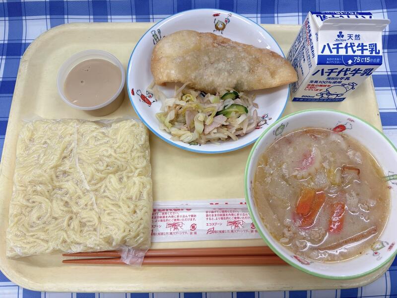 中華麺、ちゃんぽん(具)、揚げぎょうざ、ハムサラダ、紅茶プリン、牛乳