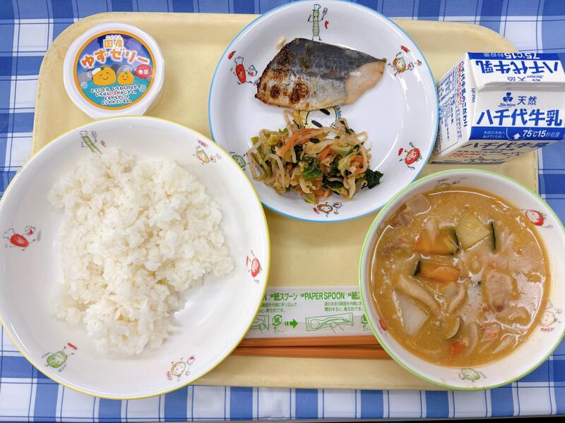 ごはん、さわらの西京焼き、からし和え、かぼちゃのすいとん汁、ゆずゼリー、牛乳