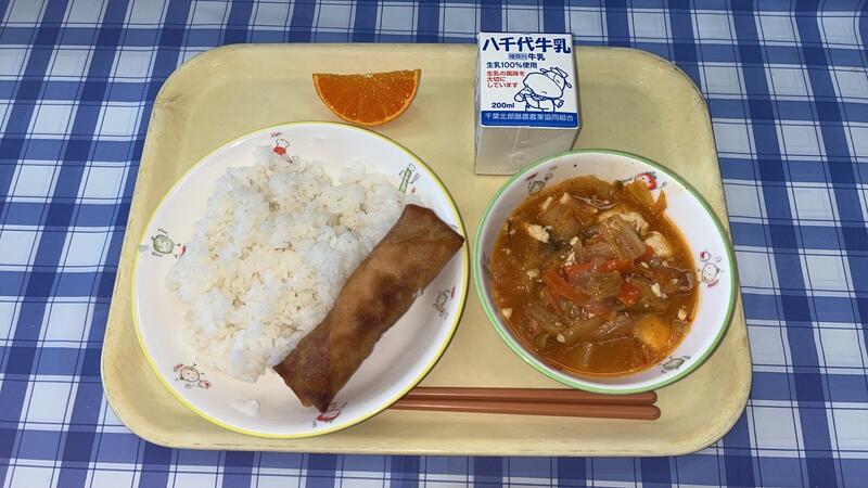 ごはん(強化米入り)、いかの梅みそ天ぷら、もやしもコーンのごま和え、かきたま汁、ひとくちアセロラゼリー、牛乳