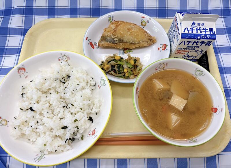 わかめごはん、あじのから揚げ、ごま和え、根菜のみそ汁、ミルメークコーヒー、牛乳