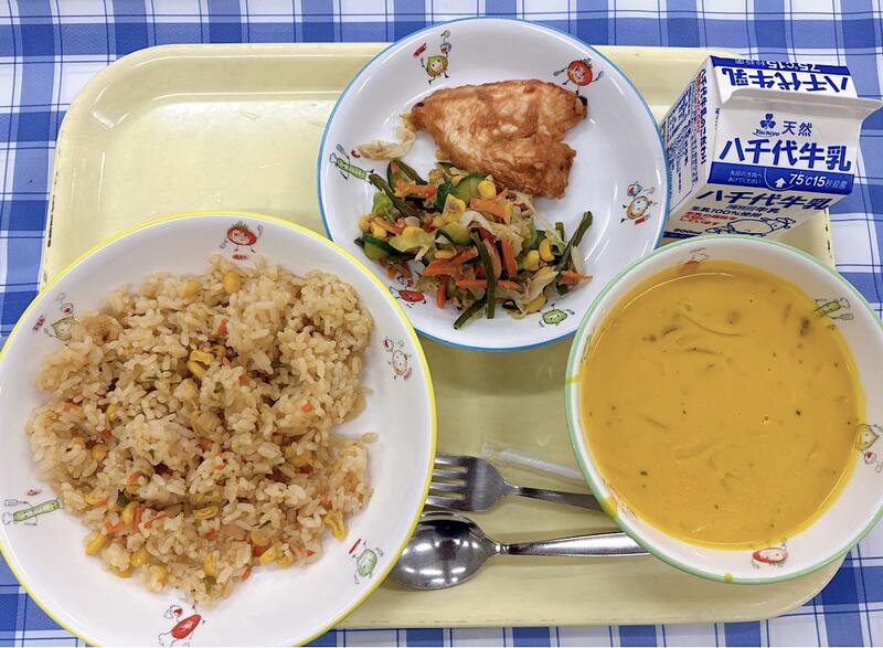 コーンピラフ、タンドリーチキン、茎わかめツナサラダ、かぼちゃのポタージュ、牛乳