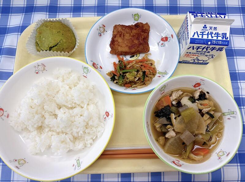 ごはん、豚肉のかりんとう揚げ、おかか和え、けんちん汁、抹茶ケーキ