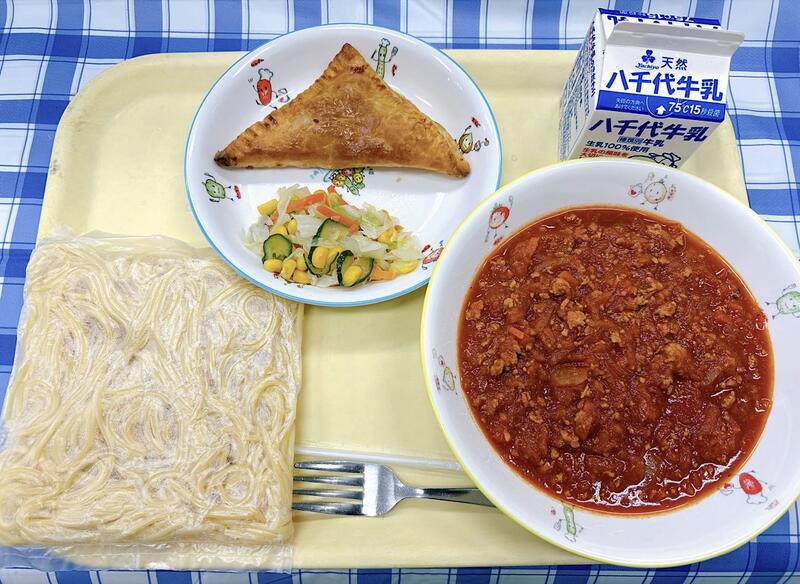 スパゲッティ、ミートソース、コールスローサラダ、さつまいもと栗の三角パイ